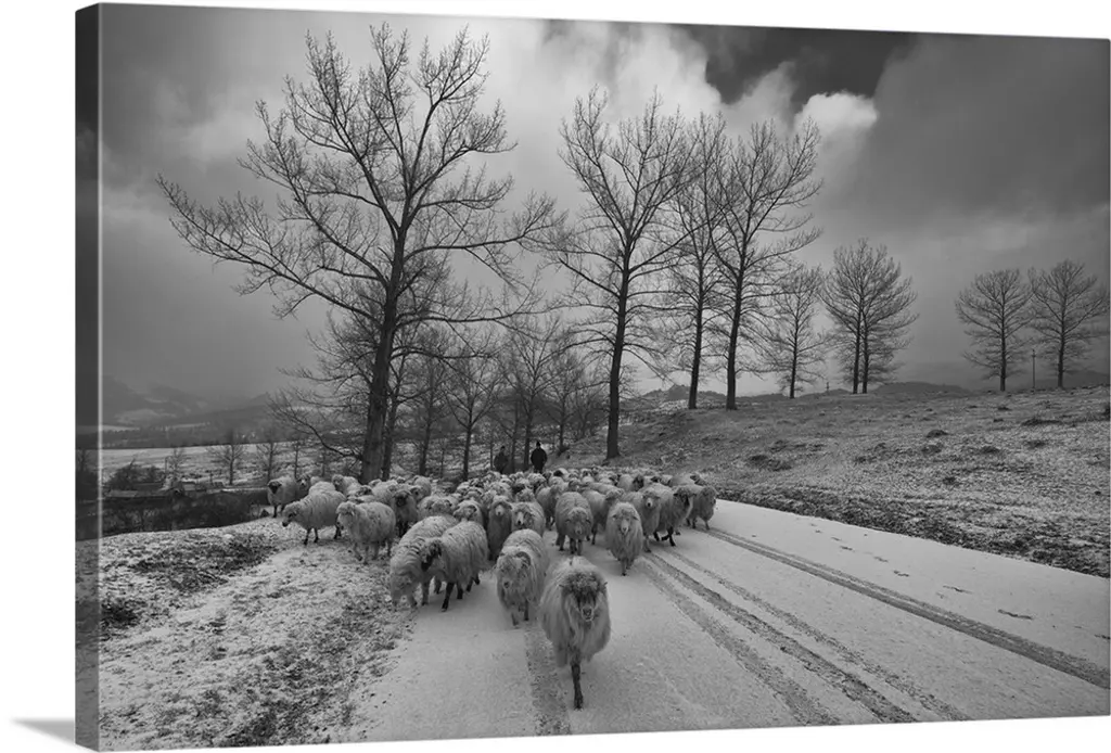 Bring the rustic charm of the countryside into your home with the 20"x24" Sheep Crossing Gallery Wrap Canvas. This captivating piece of canvas art features a serene scene of sheep crossing a rural road, captured in natural, black, brown, and blue hues. The horizontal orientation and detailed photography make it an ideal addition to any room seeking a touch of natural beauty.