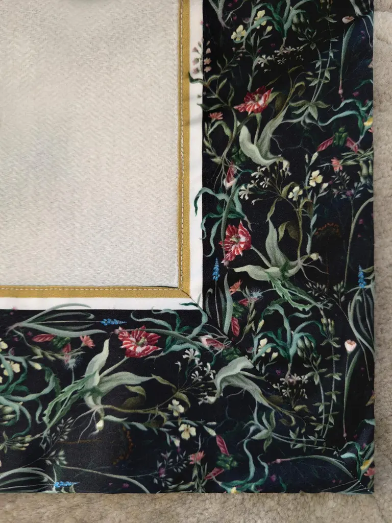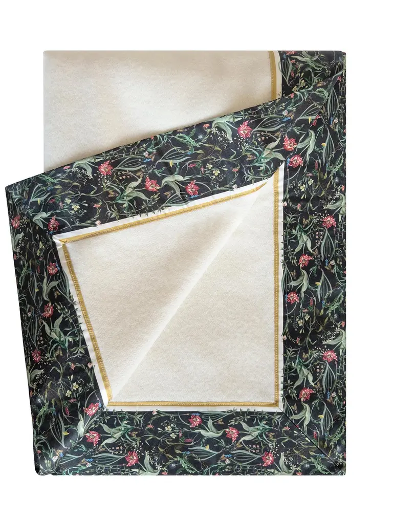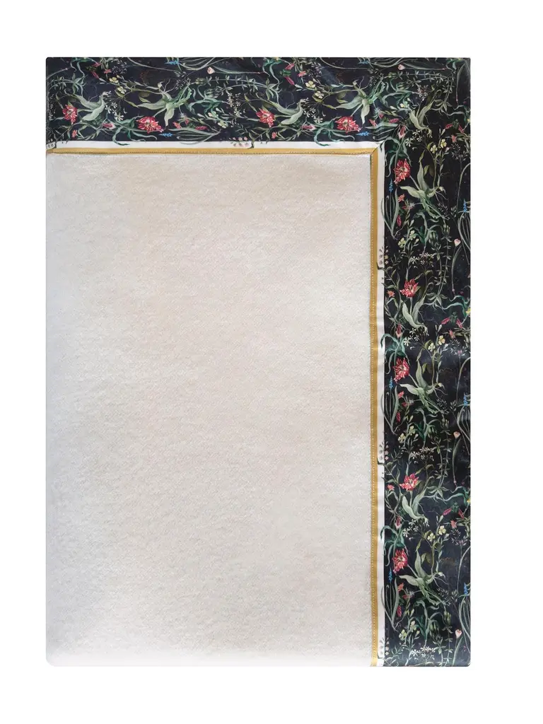 Our "Botticelli" plaid, realised in a luxurious blend of 70% cashmere and 30% silk and edged in printed silk, is a superb addition to any refined home or designer bedroom furniture: in its candor, warmth and softness this blanket combines fine materials and exquisite craftsmanship with a touch of magic given by the floral design of its edges.This blanket is the ideal companion for relaxing times on the sofa or on the bed, thanks to its soothing colour, the softness and warmth of cashmere and the unique texture given by silk.Its neutral color makes it suitable for any decor; the contrasting edge realised in printed silk with a floral pattern, reminiscing the backgrounds of the finest paintings of Renaissance art and embellished with a golden stripe, makes this blanket a perfect example of modern Italian design.