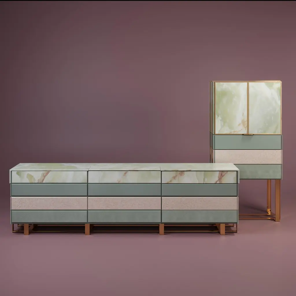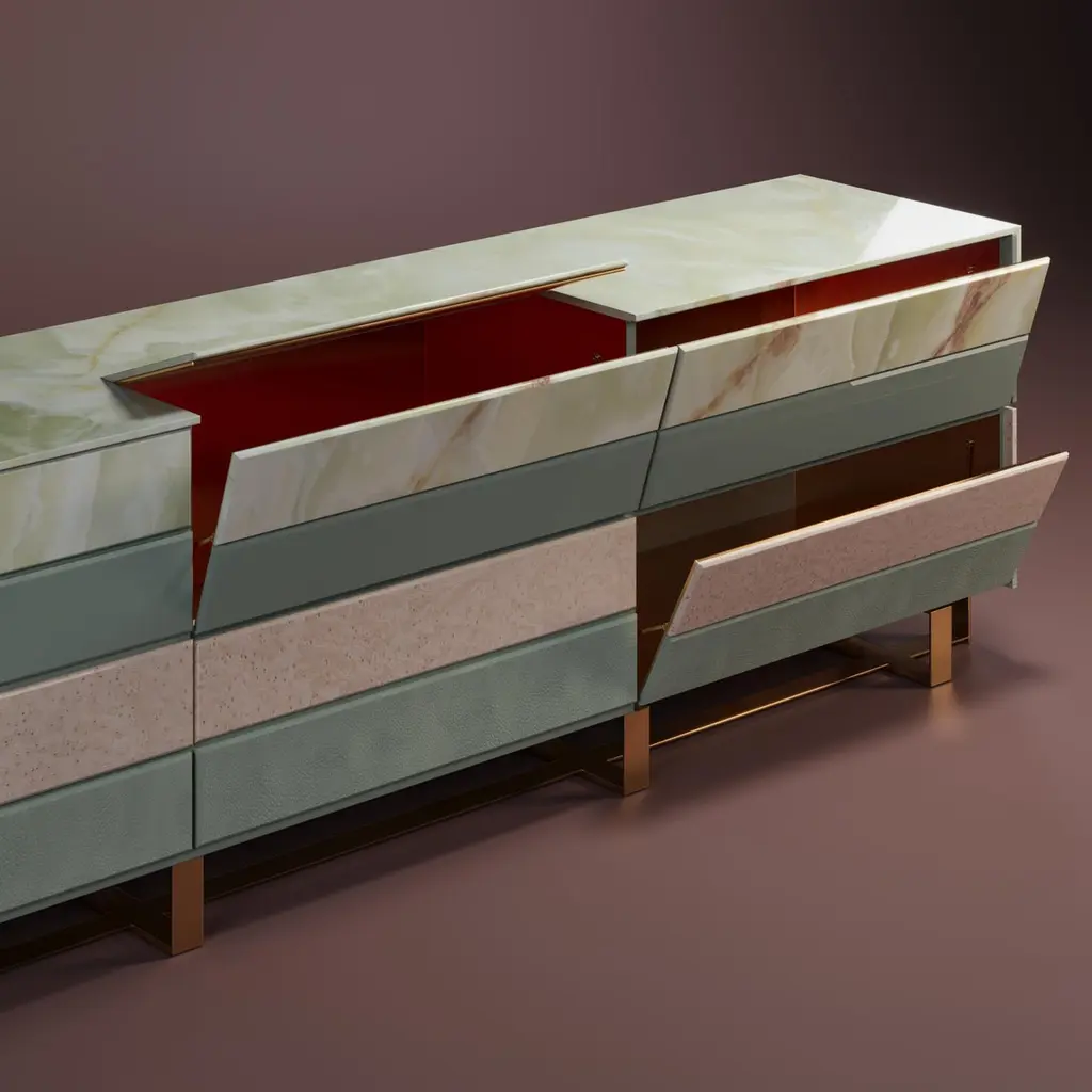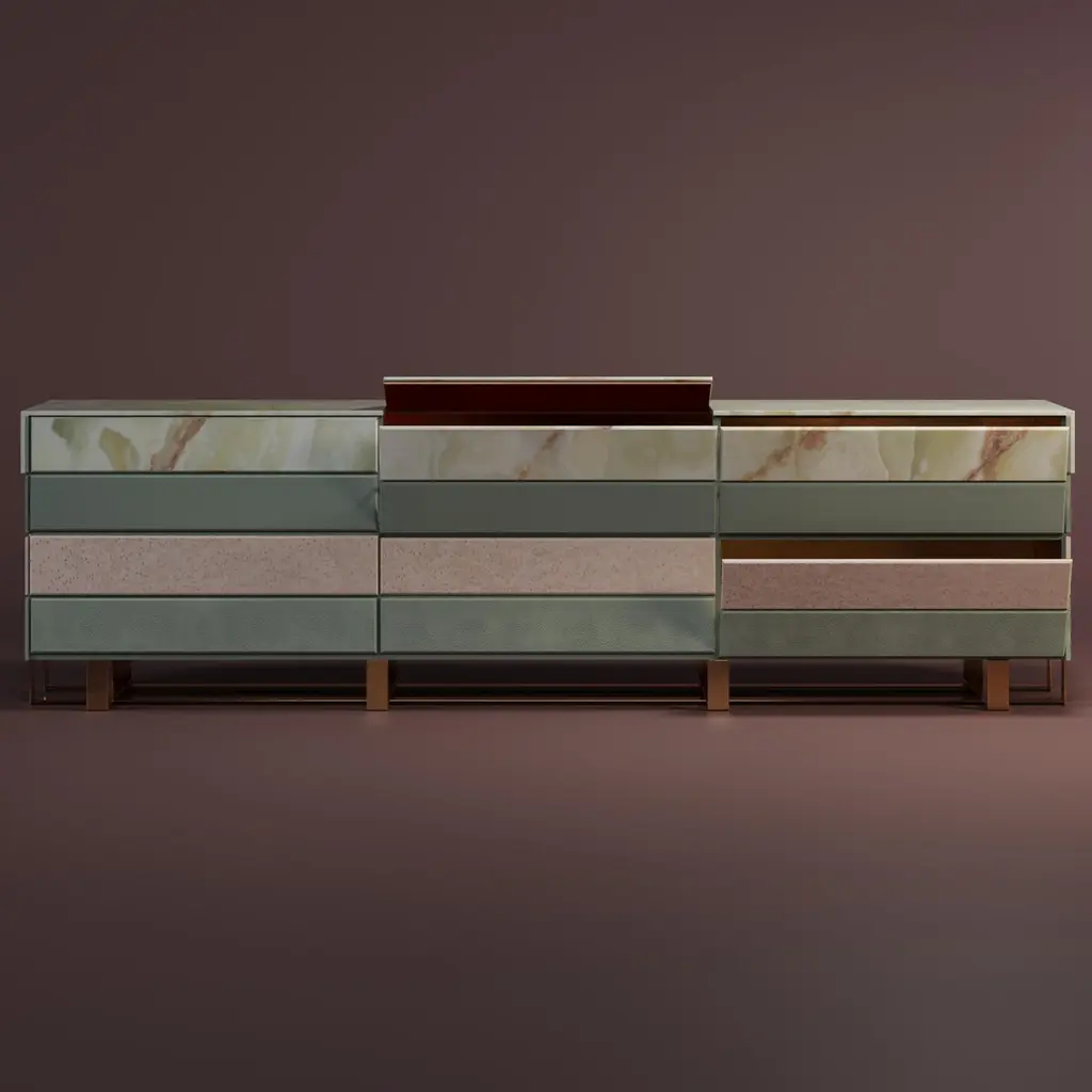 Hollow is a public artwork, installed on the grounds of Bristol University by the architects Zeller & Moye and the famous artist Katie Paterson. It combines different types of wood from more than 10,000 tree species from every country on the planet. Inspired by this magnificent structure, Malabar designers conceived this modern sideboard. The Hollow Sideboard features a diversity of high-end materials such as white bird’s eye wood veneer, light green onyx marble, and natural leather, blended with a polished brass structure. By providing a stunning landscape in your home décor, this dynamic sideboard will bring you closer to nature.