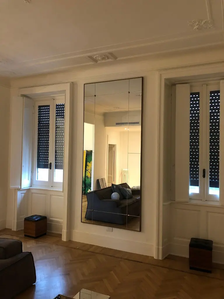 Pescetta presents its collection of contemporary customizable mirrors.With brass frame, window pane look and brass studs these mirrors replicate the idea of early 20th century Art Deco style mirrors. They suit both modern spaces which need a touch of elegance and very classical rooms which need a wall decoration. They can be hanged in both directions or kept on the floor as floor mirrors. Each mirror is a unique, an handmade piece, characterized by Italian quality and taste.Lead time 20 business days. Price here refers to a mirror with following characteristics: Frame size and shape: rectangularW 110 cm 43 inch.H 250 cm 98 inch.Brass frame: Double profileBrass finishing: Aged effectMirror panels: Window look with 4 studsMirror Glass: ClassicAccessories: Rounded studsMany details are customizable: 1) Frame size and shape: squared, rectangular, oval, rounded, hexagonal, octagonal. 2)Brass frame: simple profile or double profile. 3)Brass finishing: shiny or aged effect ( little bit darker) 4)Mirror panels: unique glass panel or Window look ( with brass studs or brass profiles) 5)Mirror Glass: Classic, aged effect, beveled. 6)Accessories: studs, hangers (to transform the mirror into a coat rack), lights. Kind of mirror a) Classic: normal silver color mirror. b) Smoked: Smoke grey (cold effect) distortion of reflected colors. c) BRONZE: Bronze (warm effect) distortion of reflected colors. d) Black and white: Classic silver base and several small spots. Most used one, light distressed effect, clear vision, no distortion of reflected colors. e) Black and white /Bronze: bronze base and several small spots. Warm Bronze distortion of reflected colors. f) Silver: strong distressed look, silver base with large spots as per mirrors from 18th century. Blurred vision in the complex. g) Saturn: medium distressed look, silver base and several large light spots. Reflected colors are darker in complex. h) Antique Venetian: several light spread big spots which gently turn reflected colors into powder pink tone. Low distressed look.