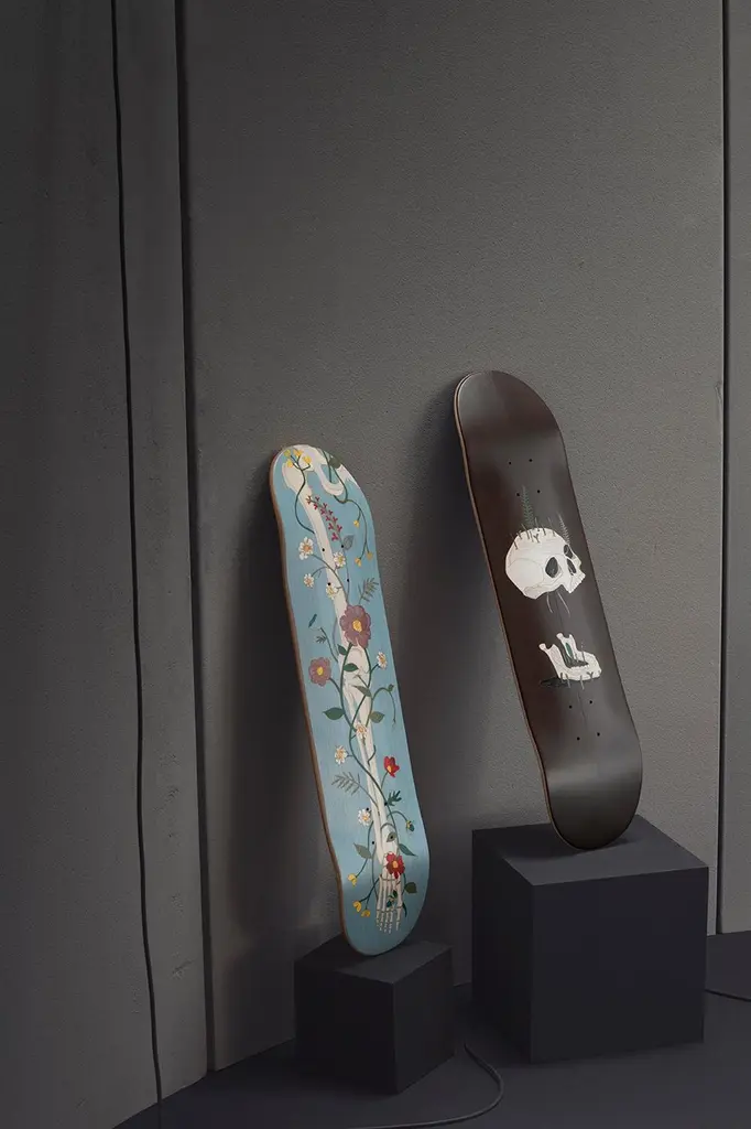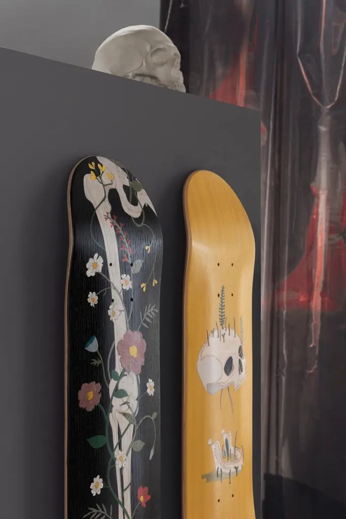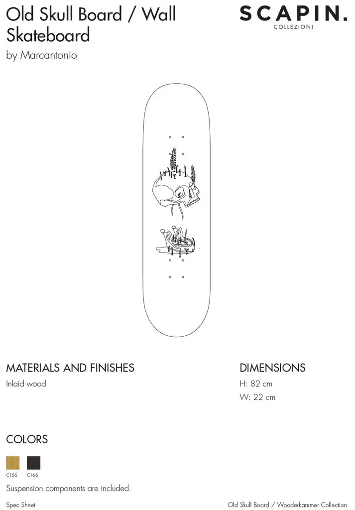 Old Skull Board Old Skull Board è una tavola da skateboard decorativa,disponibile in due varianti colore e con un disegno intarsiato simbolo della continuitàdella vita dopo la morte.Old Skull Board is a wall decorative skateboard , available in twocolors and with an inlaid draw symbol of continuity of life after death.