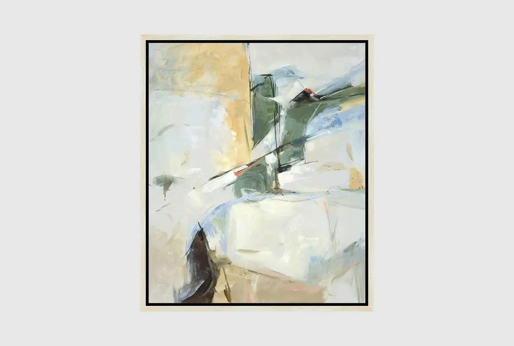 The 22X26 Abstract View Into The Valley framed art brings a touch of modern sophistication to any office space. This captivating piece features a blend of green and yellow tones on a durable canvas, creating a soft and serene landscape. Proudly made in the USA, it's designed to inspire and elevate your environment.
