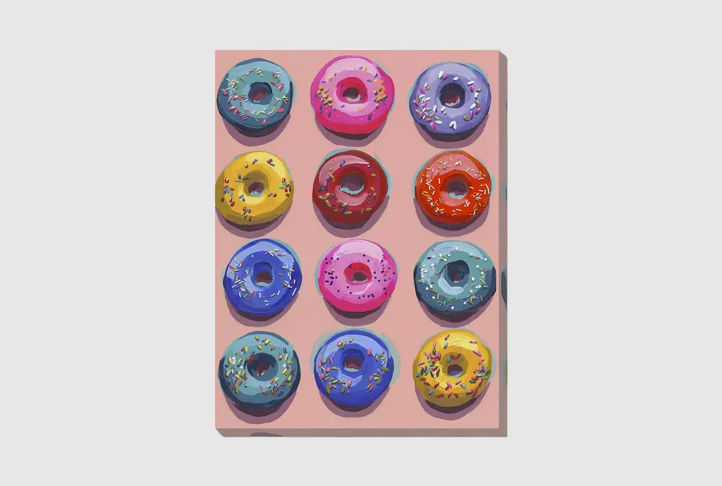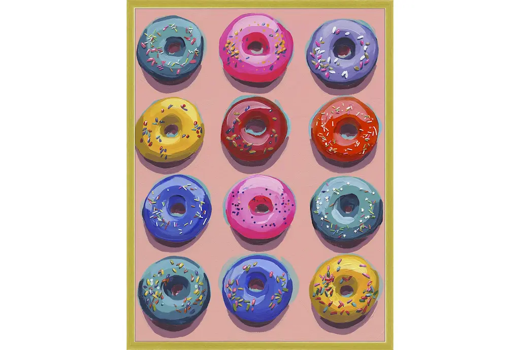 Add a touch of vibrant color and modern flair to your space with this 22x26 Dozen Donuts II framed art piece. Featuring a delightful array of donuts in a striking pink canvas, this artwork is sure to brighten up any room. The gold frame adds a sophisticated finish, making it a perfect addition to your dining room, kitchen, or kids' room.