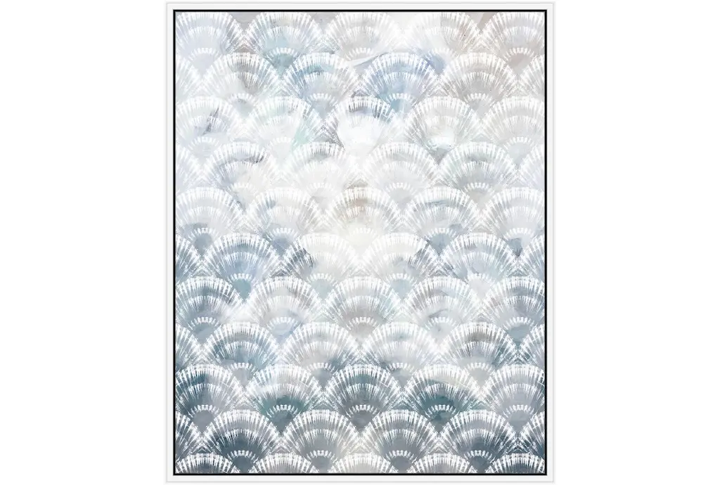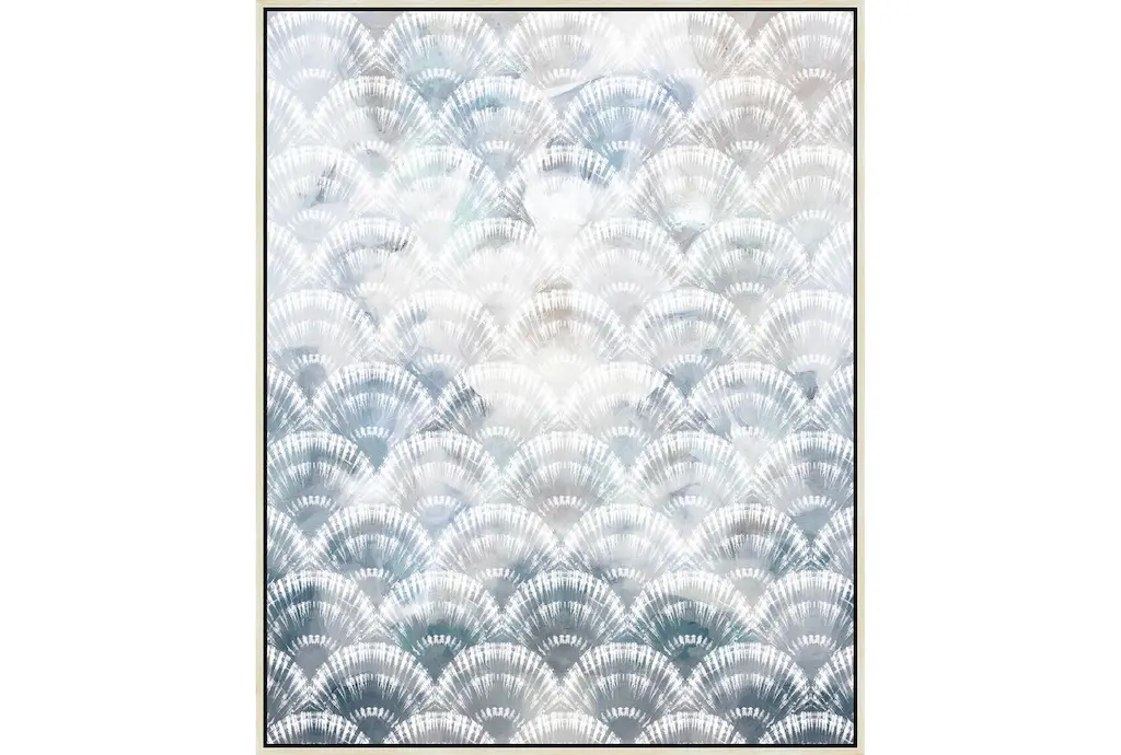 Enhance your office space with the 22X26 Soft Scallop With Birch Frame. This framed art piece features a soothing abstract design in white and blue, adding a coastal touch to your decor. Crafted from canvas, wood, and polystyrene, it's a versatile addition to any room.