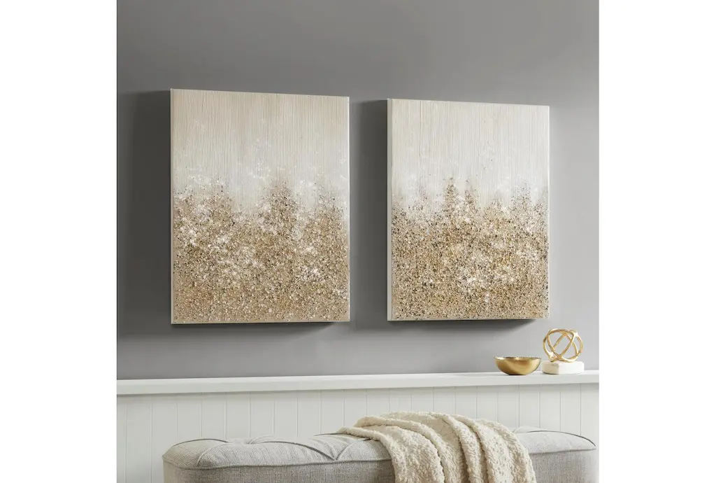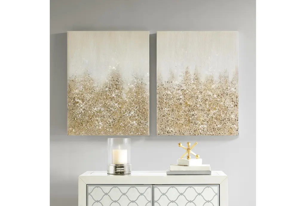 This 22X28 Golden Glimmer Set Of 2 features a modern style and is made of MDF, canvas, and paper materials with a gold and glitter finish. The set includes two pieces and has a composition of 50% MDF, 20% paper, 10% canvas, 10% acrylic, 8% sand, and 2% glitter.