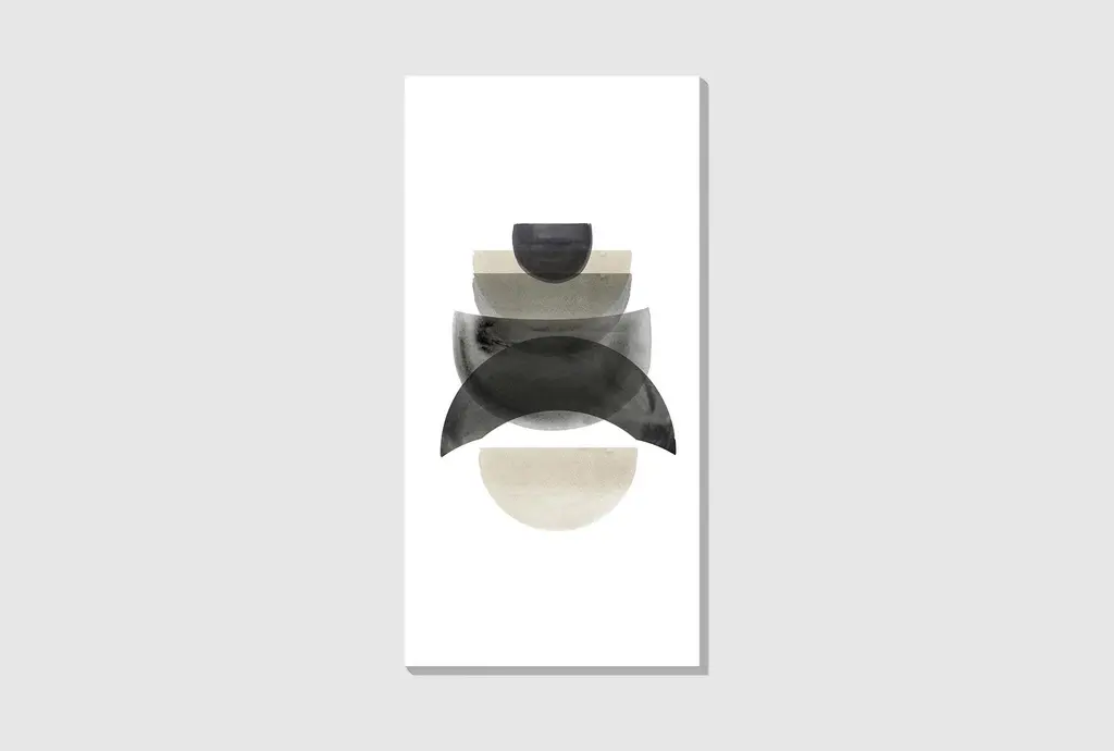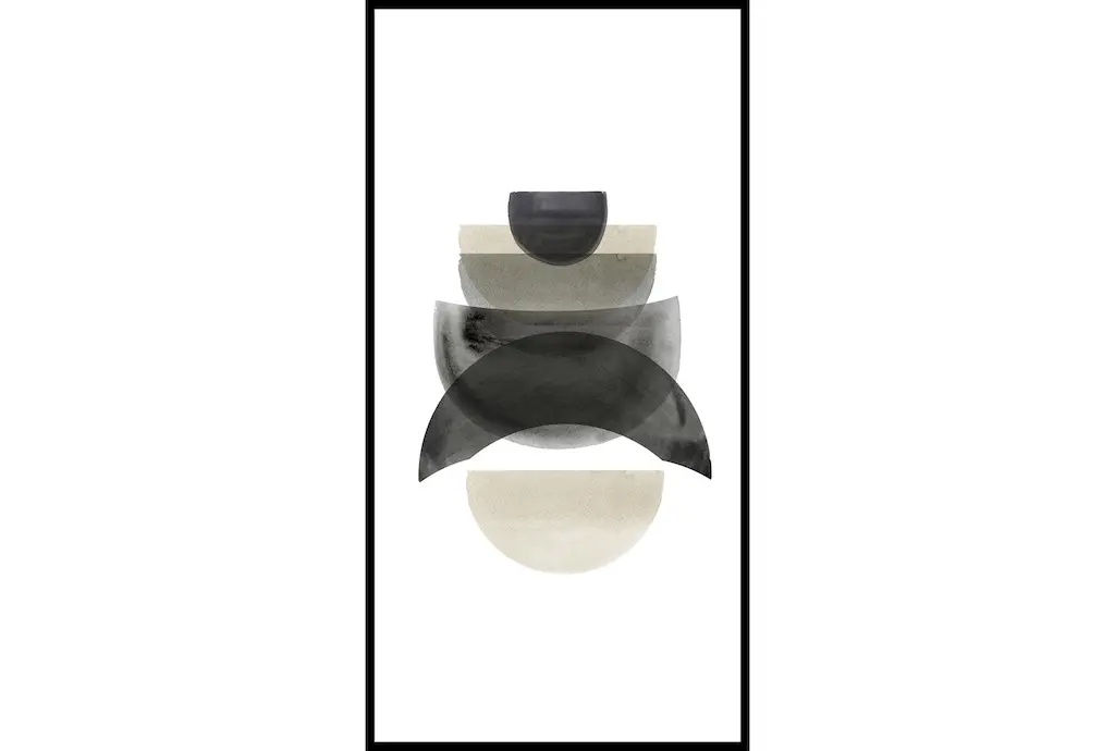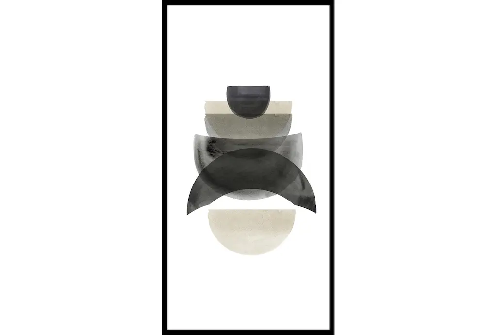 This 22X42 watercolor shape study comes with a black frame and is made in the USA. The modern style of this canvas piece is complemented by its secondary materials of wood and polystyrene, and its color palette includes black and pine.