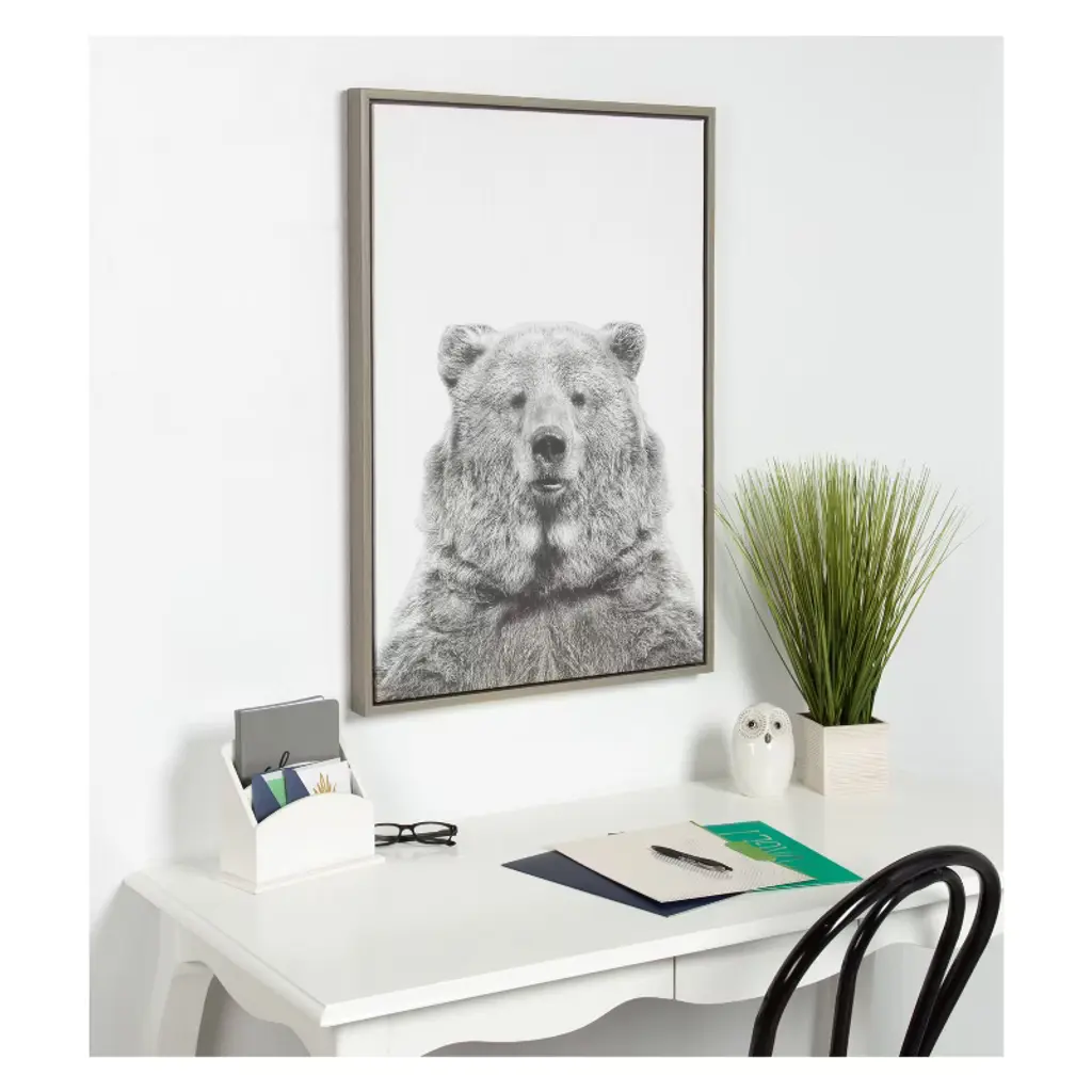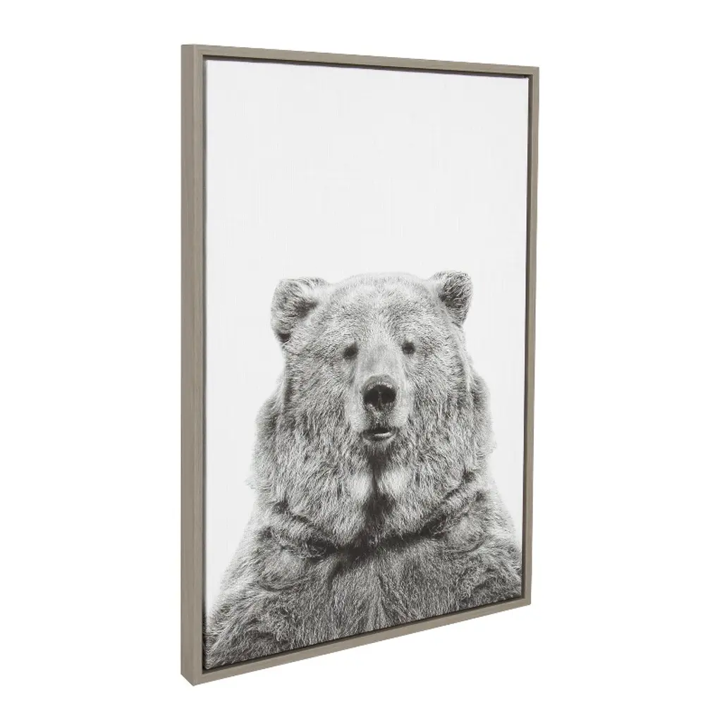 Bring the beauty of nature in its pure form and display your love of animals in your home with this striking bear portrait by Simon Te. This framed floating canvas art will be the center of your home decor. Printed on gallery wrapped canvas and framed with a gold, gray, or natural woodgrain polystyrene frame, this animal wall art has two sawtooth hangers already attached to the inset MDF back for easy wall display. Origin: USA with Imported and Domestic Parts