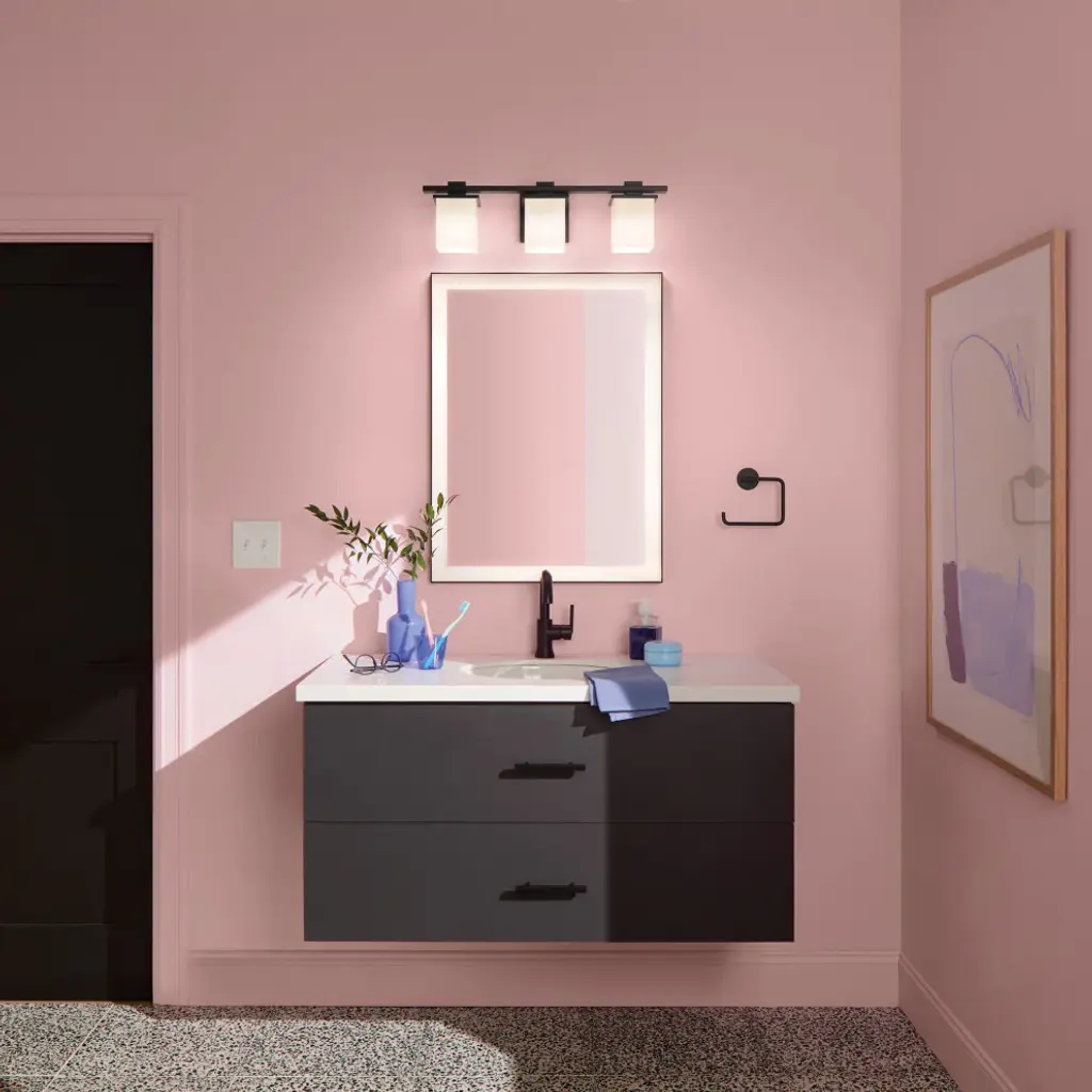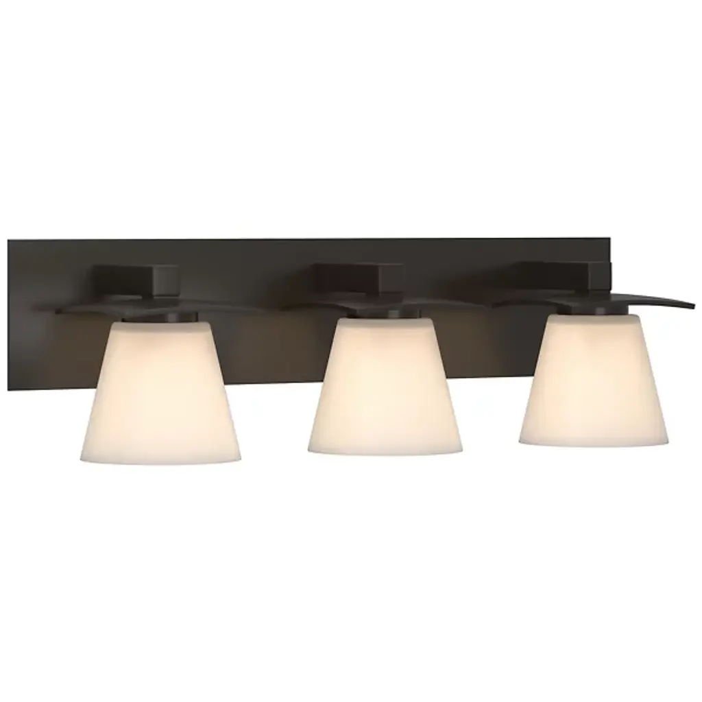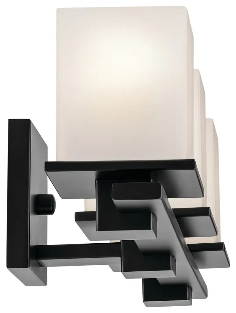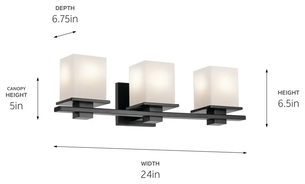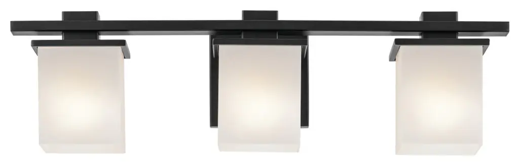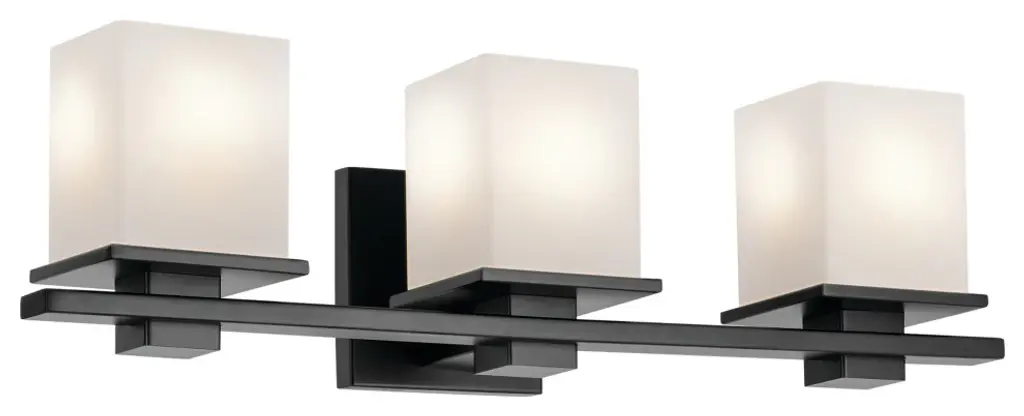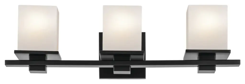 Clean and sleek, the geometric design of this 3-light vanity light is a simple yet sophisticated addition for any soft modern space. Its current, on-trend black finish is ideal for creating contrast to light-colored walls and allows it to easily coordinate with other black finish lighting, hardware, and plumbing fixtures through your home. As versatile as it is beautiful, this fixtures satin-etched cased opal glass creates a soft, ambient glow and is removeable for ease of cleaning and replacement.
