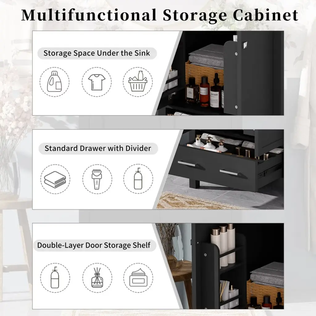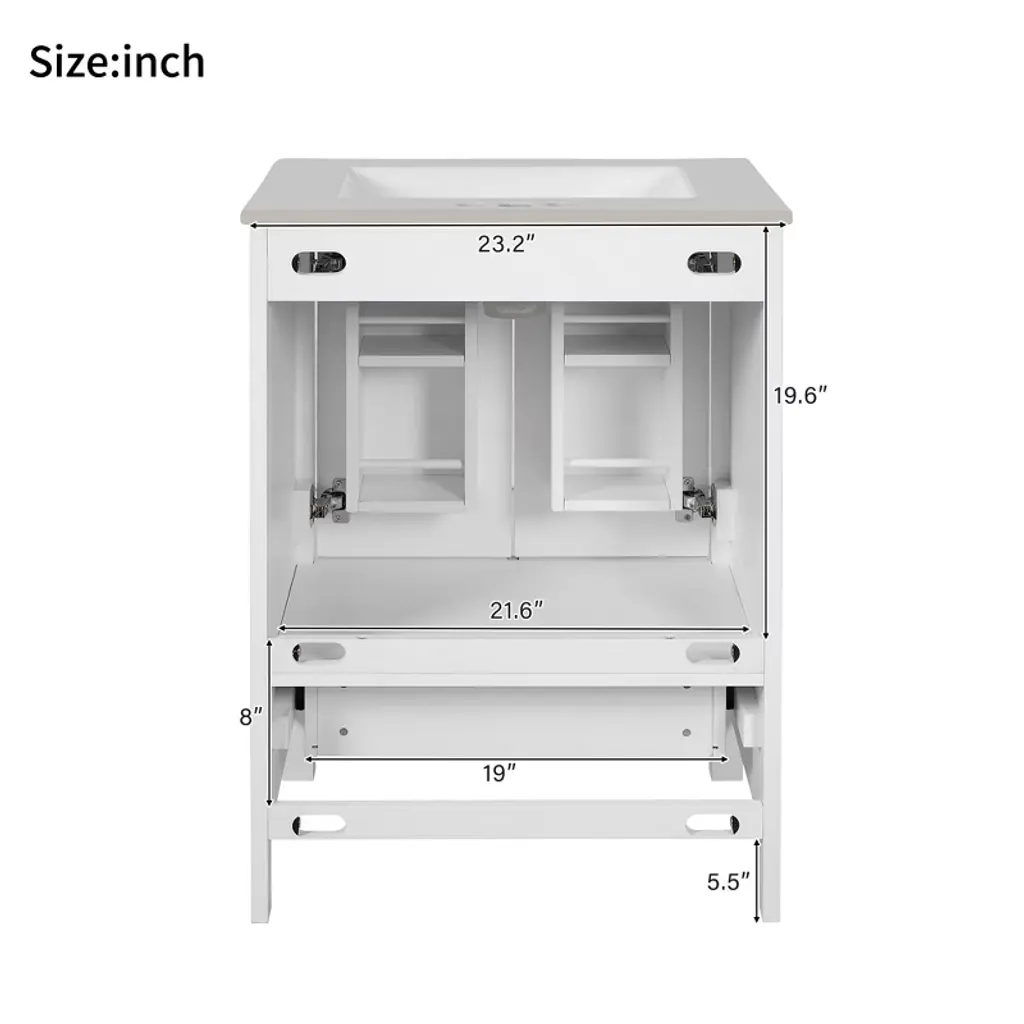 Product Overview This 24-inch transitional bathroom vanity features a compact yet functional design, ideal for small or guest bathrooms. With an integrated ceramic sink, soft-close doors, and versatile storage options, it brings both elegance and practicality to your space. Specifications Product Type: Bathroom Vanity Style: Transitional Mounting Type: Free-standing Cabinet Color: Painted Finish Main Material: Solid Wood + MDF Sink Material: Ceramic Sink Type: Undermount / Drop-in Sink Shape: Rectangular Faucet Mount: 4" Centerset (faucet not included) Overflow Hole: Yes Vanity Top Edge Type: Flat Edge Thickness: 0.8" Number of Doors: 2 Number of Drawers: 1 Handle Material: Zinc Alloy Soft Close Door Hinges: Yes Product Dimensions Overall: 24.00"W x 18.30"D x 33.90"H Weight: 77.16 lbs Product Features ✔ Space-Saving Design – 24-inch width fits compact bathrooms while offering full functionality. ✔ Durable Ceramic Sink – Scratch-resistant, easy to clean, with overflow and pre-drilled faucet holes. ✔ Ample Storage Options – 2 soft-close doors, 1 divider drawer, and built-in double-layer racks maximize organization. ✔ Solid Wood Frame – Rubberwood frame + MDF panels provide strength and long-lasting performance. ✔ Soft-Close Hinges – Quiet, smooth door operation adds comfort and safety. ✔ Stylish Silver Handles – Sleek zinc alloy handles enhance modern appeal. ✔ Exquisite Painting Craftsmanship – Hand-painted finish for smooth texture and enhanced quality. ✔ Protective Plastic Feet – Moisture-resistant and floor-friendly design for bathroom safety. ✔ Large Under-Cabinet Storage – Roomy interior behind doors for towels, cleaning supplies, or bulkier items. ✔ Easy Assembly – Includes detailed instructions for a simple 2-person setup. Notes 1. Real product color may vary slightly due to lighting or monitor display. 2. Manual measurement has been used; slight variations may occur.
