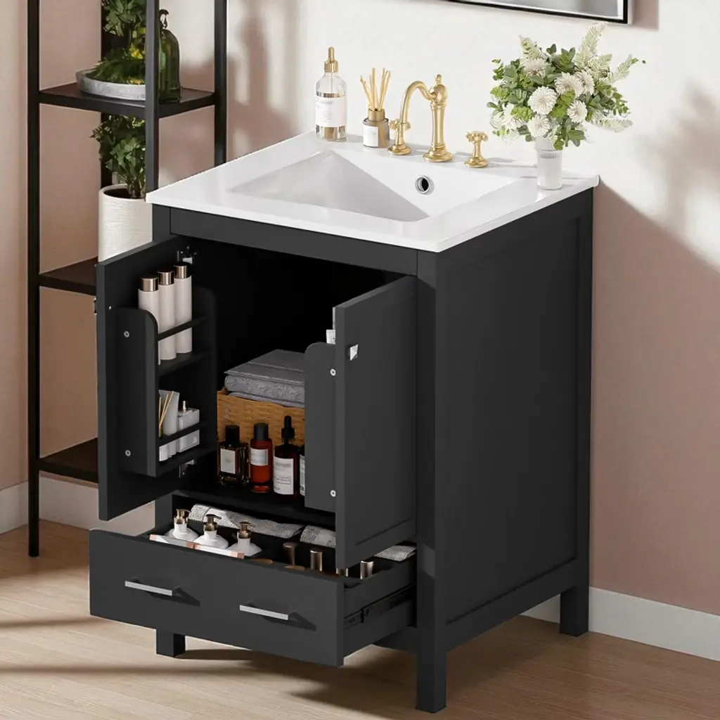 24" Bathroom Vanity With Integrated Ceramic Sink, Solid Wood Frame, 2 Doors, 1 Drawer, Double-layer Door Shelves, Soft Close