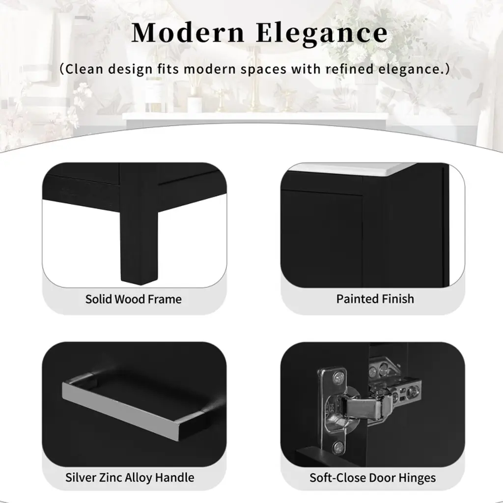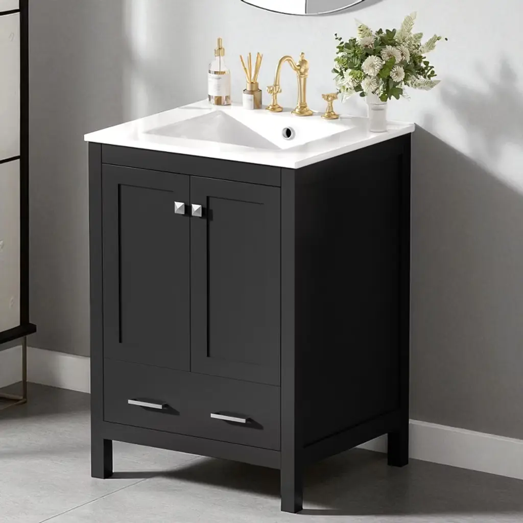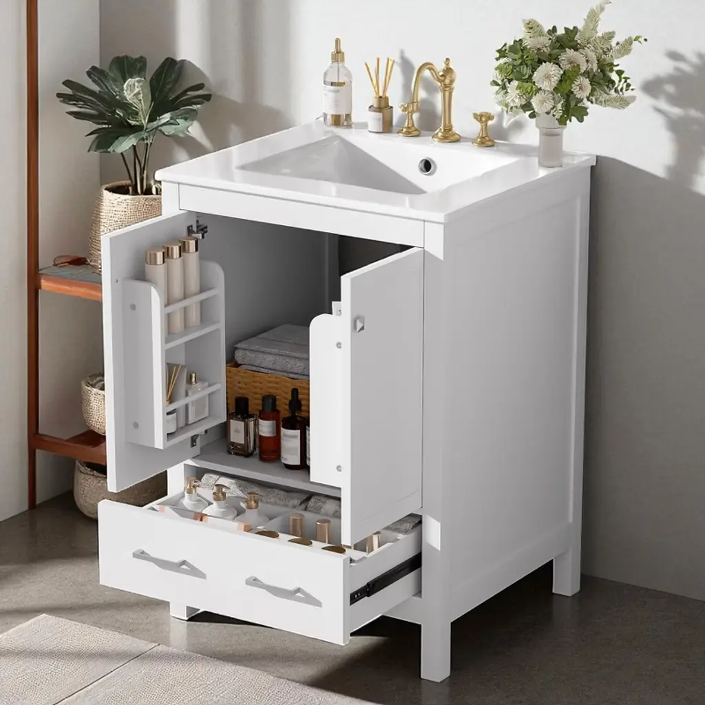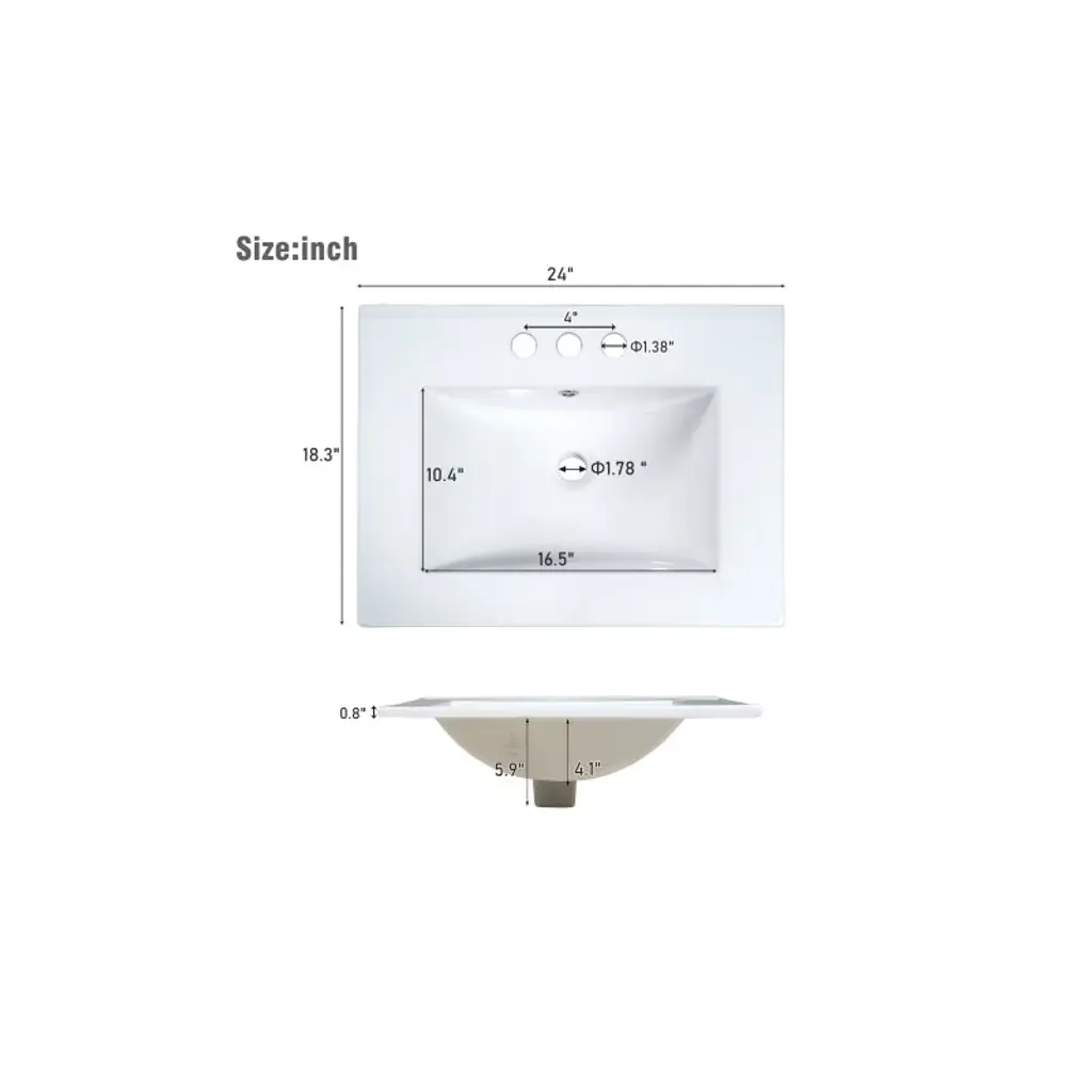 Product Overview This 24-inch transitional bathroom vanity features a compact yet functional design, ideal for small or guest bathrooms. With an integrated ceramic sink, soft-close doors, and versatile storage options, it brings both elegance and practicality to your space. Specifications Product Type: Bathroom Vanity Style: Transitional Mounting Type: Free-standing Cabinet Color: Painted Finish Main Material: Solid Wood + MDF Sink Material: Ceramic Sink Type: Undermount / Drop-in Sink Shape: Rectangular Faucet Mount: 4" Centerset (faucet not included) Overflow Hole: Yes Vanity Top Edge Type: Flat Edge Thickness: 0.8" Number of Doors: 2 Number of Drawers: 1 Handle Material: Zinc Alloy Soft Close Door Hinges: Yes Product Dimensions Overall: 24.00"W x 18.30"D x 33.90"H Weight: 77.16 lbs Product Features ✔ Space-Saving Design – 24-inch width fits compact bathrooms while offering full functionality. ✔ Durable Ceramic Sink – Scratch-resistant, easy to clean, with overflow and pre-drilled faucet holes. ✔ Ample Storage Options – 2 soft-close doors, 1 divider drawer, and built-in double-layer racks maximize organization. ✔ Solid Wood Frame – Rubberwood frame + MDF panels provide strength and long-lasting performance. ✔ Soft-Close Hinges – Quiet, smooth door operation adds comfort and safety. ✔ Stylish Silver Handles – Sleek zinc alloy handles enhance modern appeal. ✔ Exquisite Painting Craftsmanship – Hand-painted finish for smooth texture and enhanced quality. ✔ Protective Plastic Feet – Moisture-resistant and floor-friendly design for bathroom safety. ✔ Large Under-Cabinet Storage – Roomy interior behind doors for towels, cleaning supplies, or bulkier items. ✔ Easy Assembly – Includes detailed instructions for a simple 2-person setup. Notes 1. Real product color may vary slightly due to lighting or monitor display. 2. Manual measurement has been used; slight variations may occur.