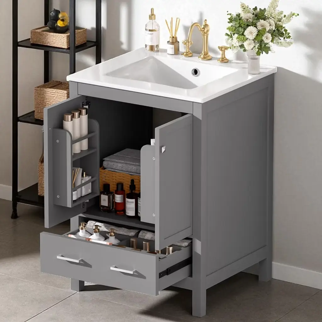 24" Bathroom Vanity With Integrated Ceramic Sink, Solid Wood Frame, 2 Doors, 1 Drawer, Double-layer Door Shelves, Soft Close