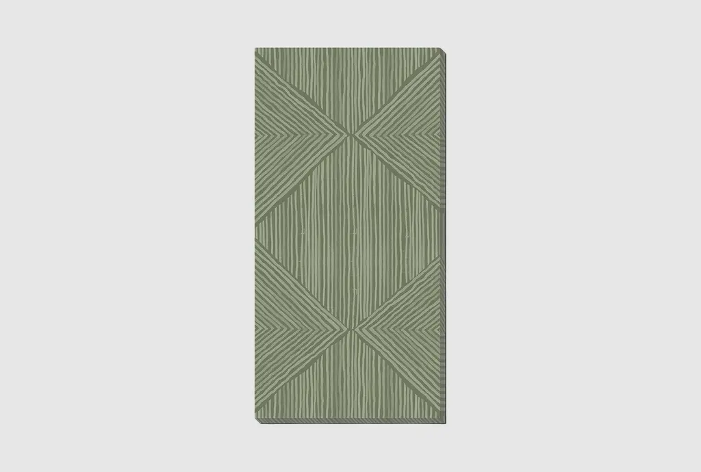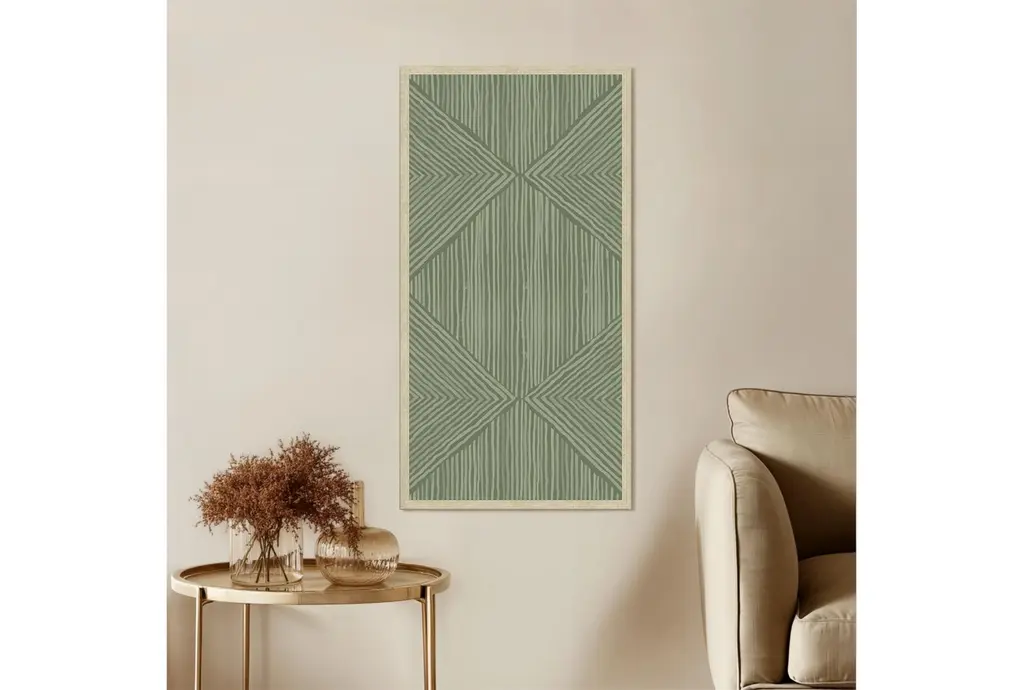 The 24X48 Organic Geometric Moss Green with Champagne Frame is a stunning vertical piece that will enhance any room with its abstract design. Made in the USA, this framed art print combines modern style with earthy green tones to create a captivating focal point. The combination of canvas, wood, and polystyrene materials ensures durability and a high-quality finish.