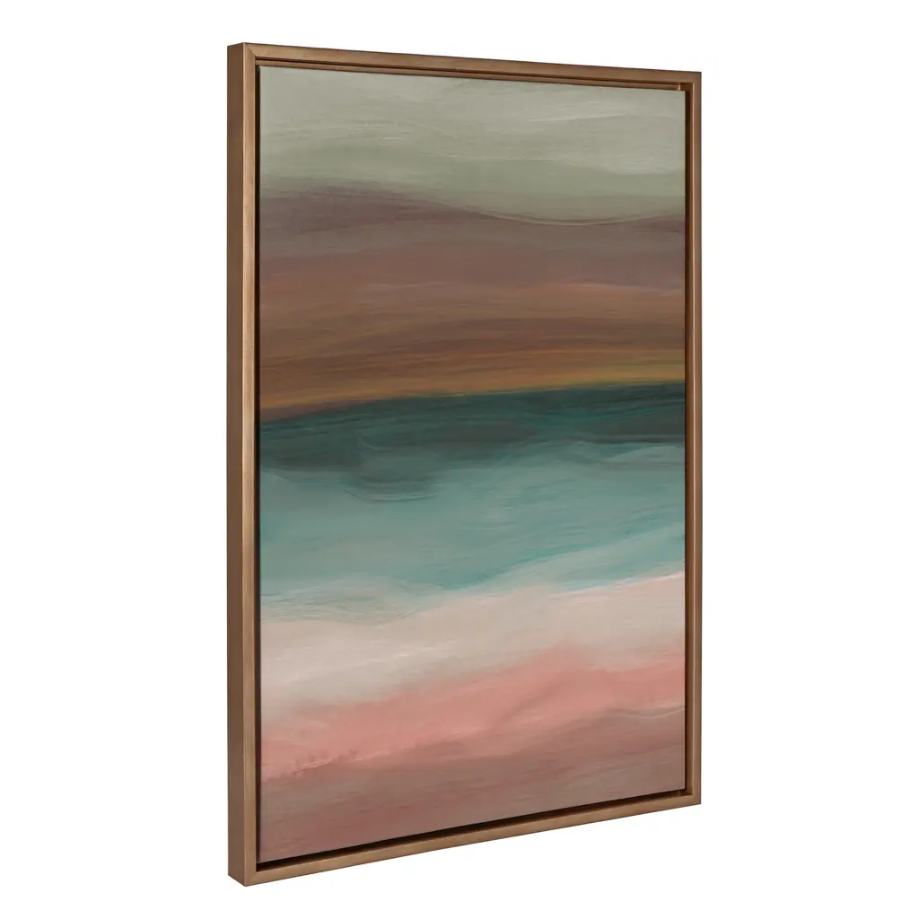 The 24X48 Sunset Over The Peak I With Champagne Frame is a rustic, multicolored piece of framed art, crafted from canvas and wood. Its abstract, non-objective design and boho-chic style make it a unique addition to any space.