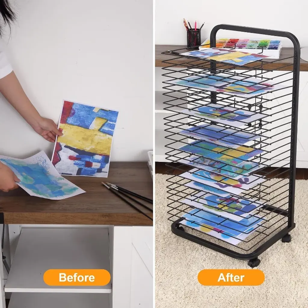 Ideal for classrooms and art studios with its efficient organisation and portable design, this multi-functional art drying rack with 16/25 removable shelves is suitable for drying paintings of all sizes and is the ideal storage solution for organising painting supplies and projects. Designed to fit into limited spaces and provide ample storage without taking up too much space, the compact design allows it to fit perfectly into home and classroom environments, maximising the use of available space. As a dedicated painting drying rack, it ensures optimal airflow for fast and even drying, allowing you to display or continue working on your artwork immediately, enhancing your creative workflow. Equipped with four lockable wheels for easy movement around the studio or classroom, the wheels ensure stability when in use, making it a convenient and reliable solution for organising your art supplies. Assemble in just three steps: screw the bottom and top frames together, install the three wheels, and place the shelves for immediate use without the time-consuming complexity of assembly. Whether it's functional design or portability, this drying rack offers both efficiency and flexibility, making it ideal for everyday use.
