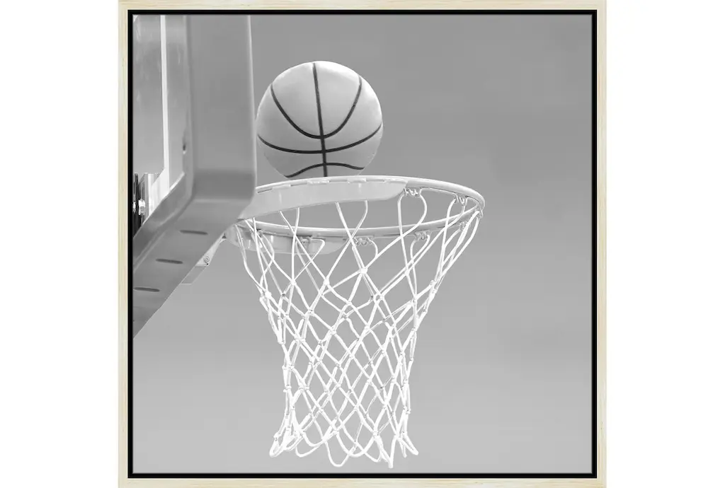 Bring a touch of sports excitement to your child's room with the 26" X 26" He Shoots - He Scores 1 framed art. This fine art photograph captures the thrilling moment of a basketball swish, making it a perfect piece for any young sports enthusiast. The black and white canvas print is complemented by a birch frame, adding a timeless feel to any space.