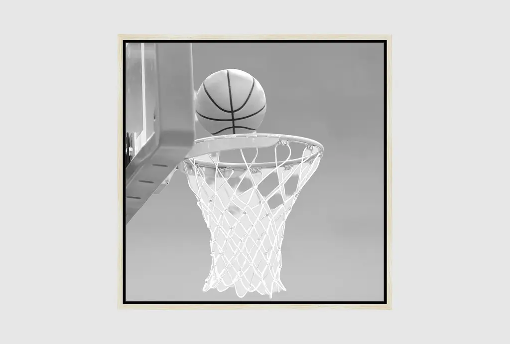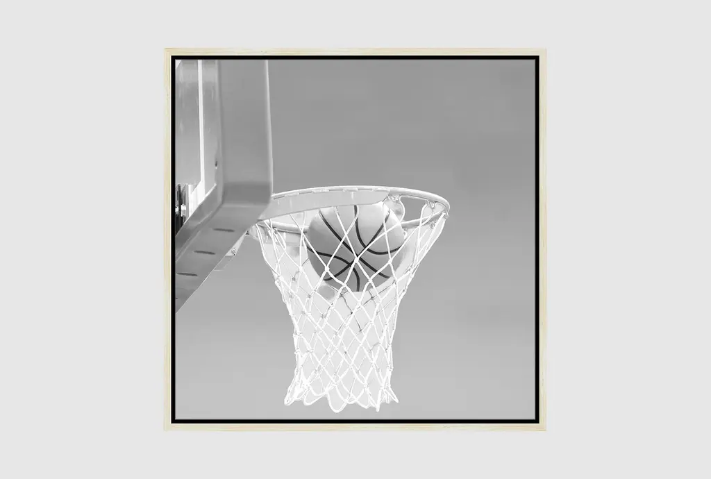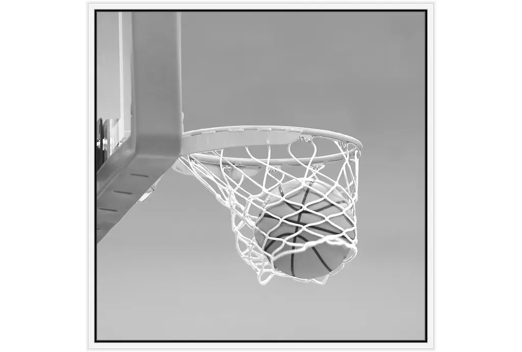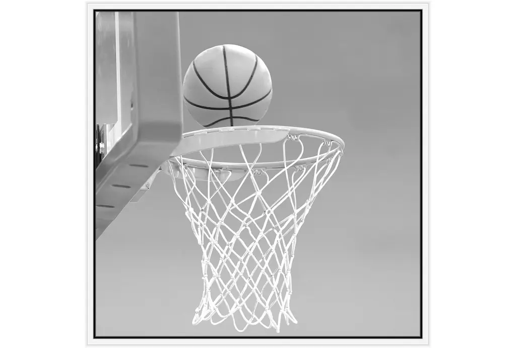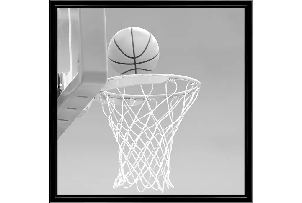 Add a touch of sports excitement to any room with the "He Shoots - He Scores" framed art piece. This black and white photograph captures the thrilling moment of a basketball scoring, making it perfect for kids' rooms or sports-themed decor. The square shape and black frame provide a sleek and modern look.