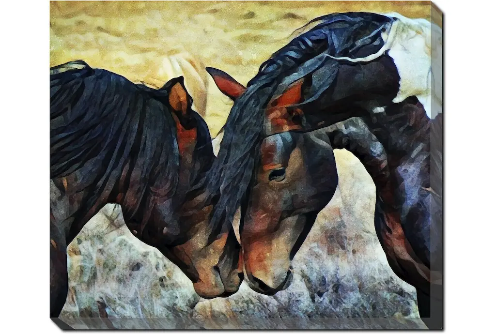 Add a touch of rustic charm to your home with the 26X22 Nuzzle Animal Print framed art. Featuring an impressionistic style, this captivating piece showcases a tender moment between two horses in a beautiful landscape setting. The black and gold tones add depth and richness, making it a perfect addition to any room.