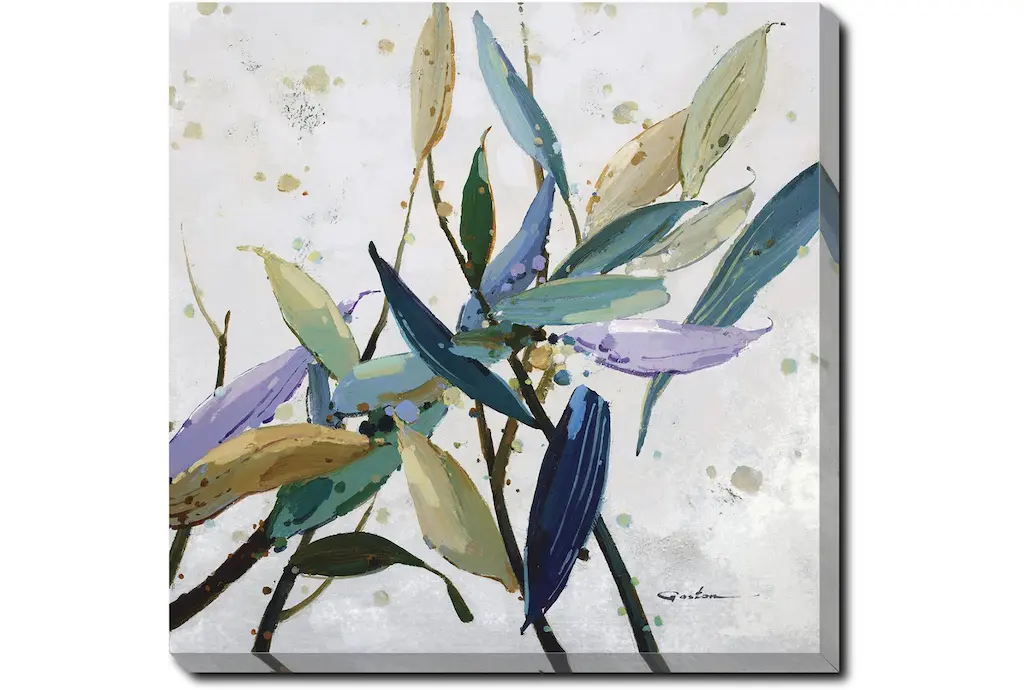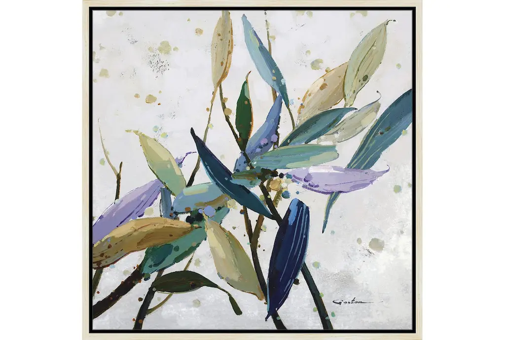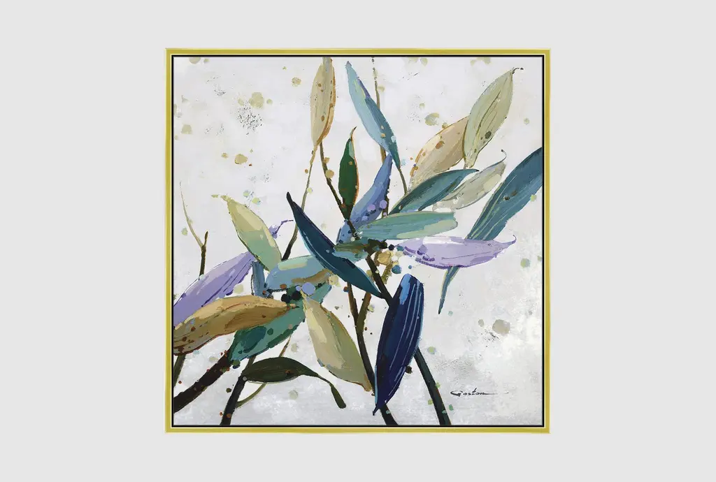 Enhance your home with the 26X26 Multi Color Leaves With Gold Frame. This beautiful piece of framed art showcases a vibrant botanical print that adds a touch of nature to any room. Made in the USA, it's perfect for the bedroom, dining room, living room, or office.