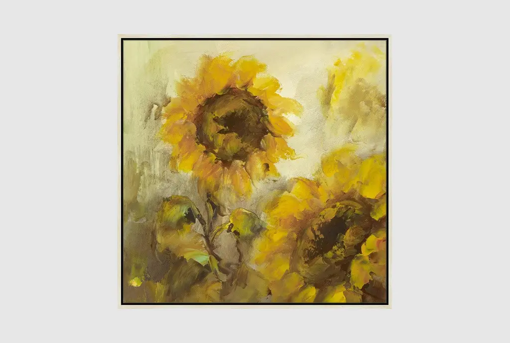Bring a touch of nature indoors with the 26X26 Sunflowers With Espresso Frame. This beautiful framed art print features vibrant yellow and brown sunflowers that add warmth and charm to any room. Crafted on canvas and framed with a sturdy wood and polystyrene combination, this piece is made in the USA and designed to last.