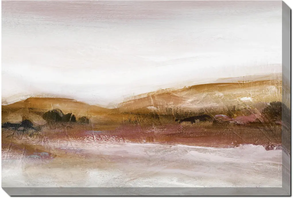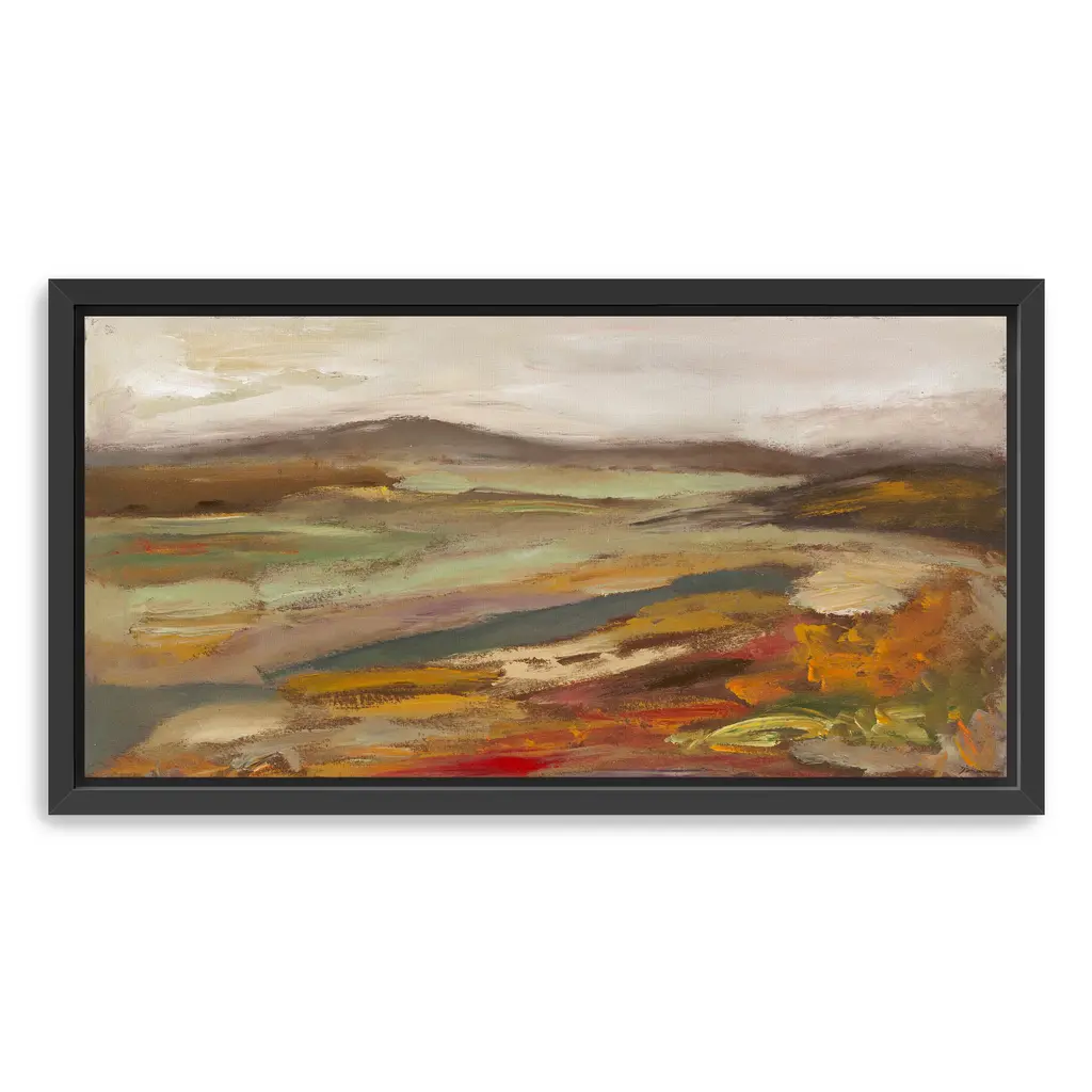 This 26X38 Golden Landscape With Black Frame is a rustic-style canvas artwork, complemented by a wooden frame. The color palette includes shades of brown, gold, and black, making it a versatile piece for any decor.