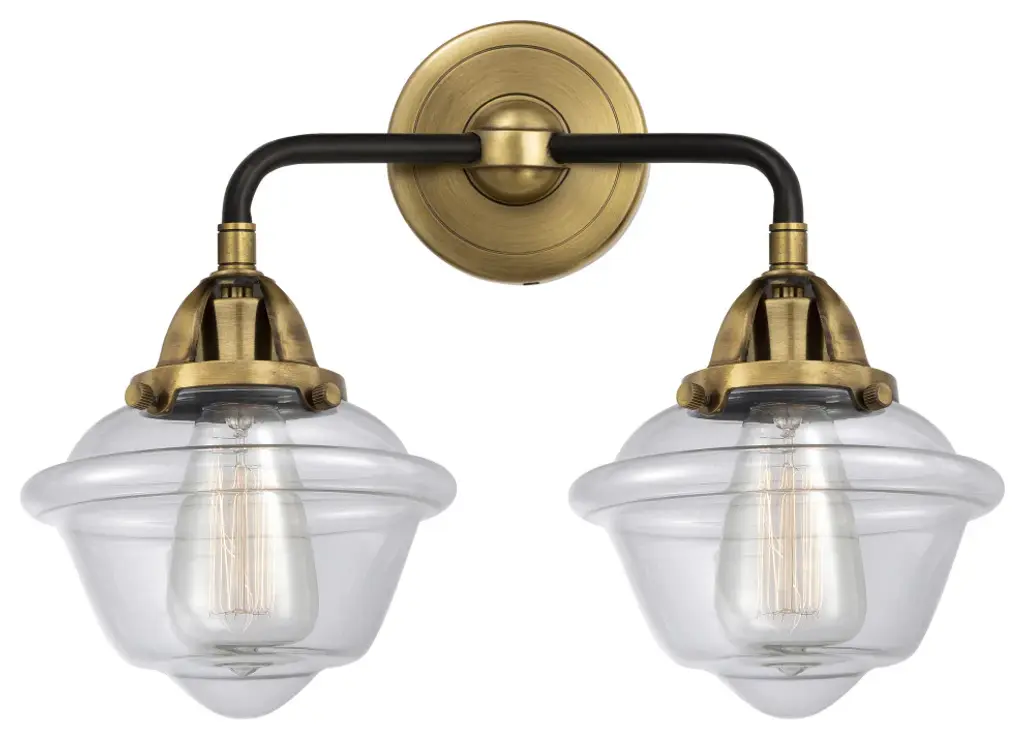 Innovations Lighting 288-2W-BAB-G534 Small Oxford 2 Light 15.5" Bath Vanity Light. Style: Transitional, Industrial, Restoration-Vintage. Collection: Nouveau 2. Material: Steel, Cast Brass, Glass. Metal Finish(Body): Black Antique Brass. Metal Finish(Canopy/Backplate): Antique Brass. Accent Color: Matte Black. Dimension(in): 12.125(H) x 15.5(W) x 8(Ext). Bulb: (2)60W Medium Base Vintage Bulb recommended(Not Included). Voltage: 120. Dimmable: Yes. Color Temperature: 2200. CRI: 99.9. Lumens: 220. Maximum Wattage Per Socket: 100. Glass Shade Description: Seedy Small Oxford. Shade Material: Glass. Glass or Metal Shade Color: Seedy. Glass Type: Seeded. Shade Size Dimension(in): 7.5(Dia) x 5.75(H). Shade Fitter Measurement: 3.25" Fitter. Canopy Dimension(in): 4.5(Dia). Backplate Dimenison(in): 4.5(Dia) x 0.75(Depth). UL and ETL Certification: Damp Location.