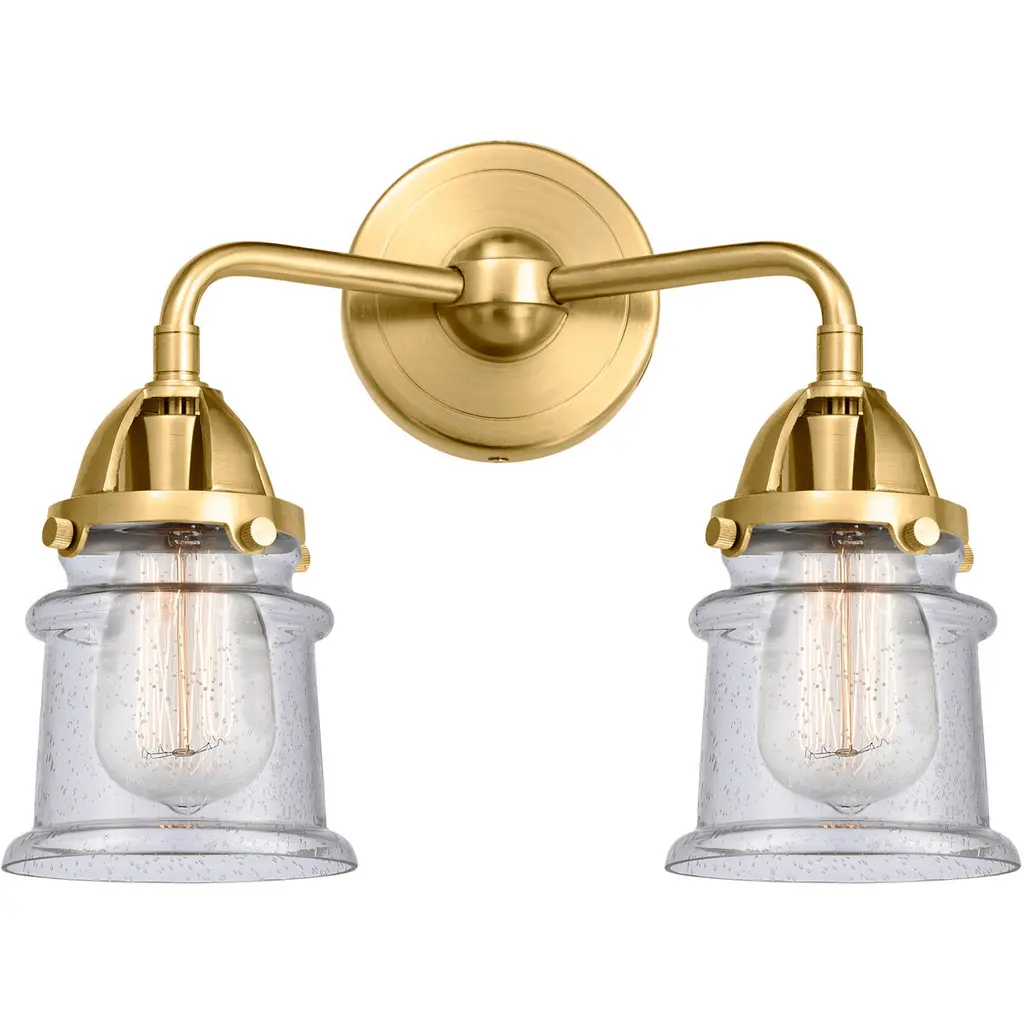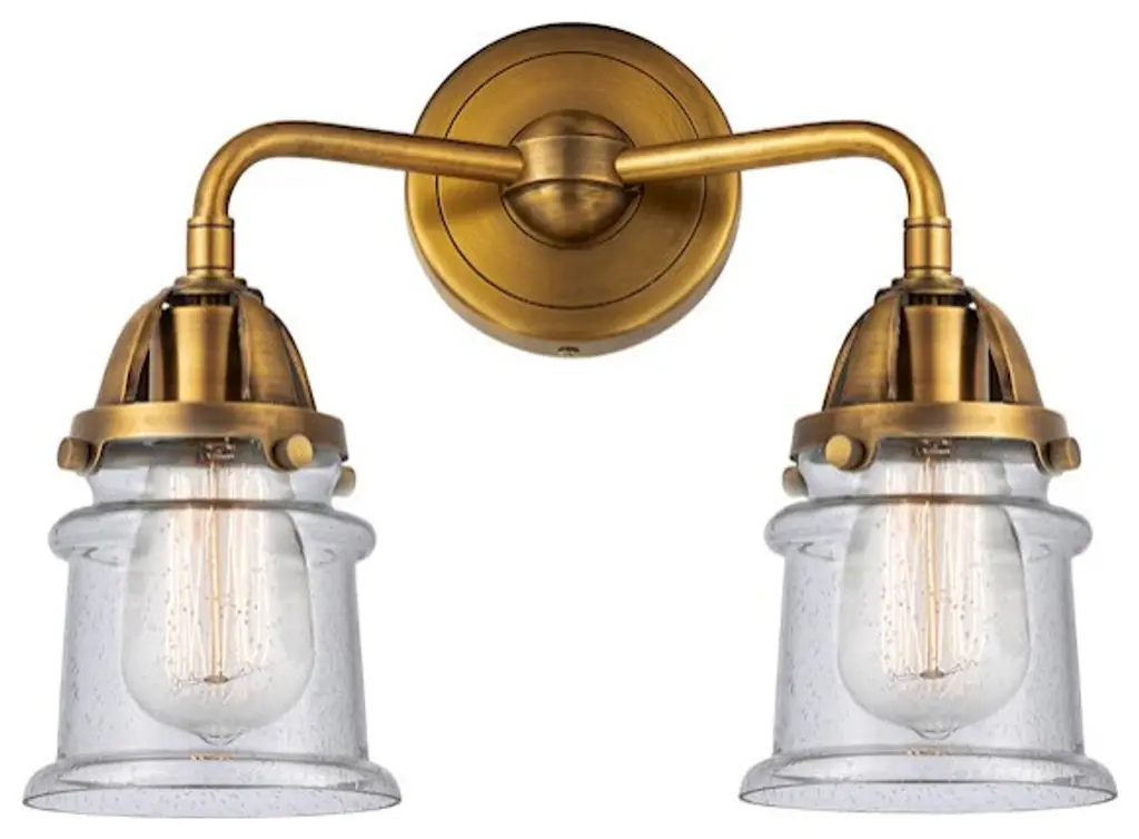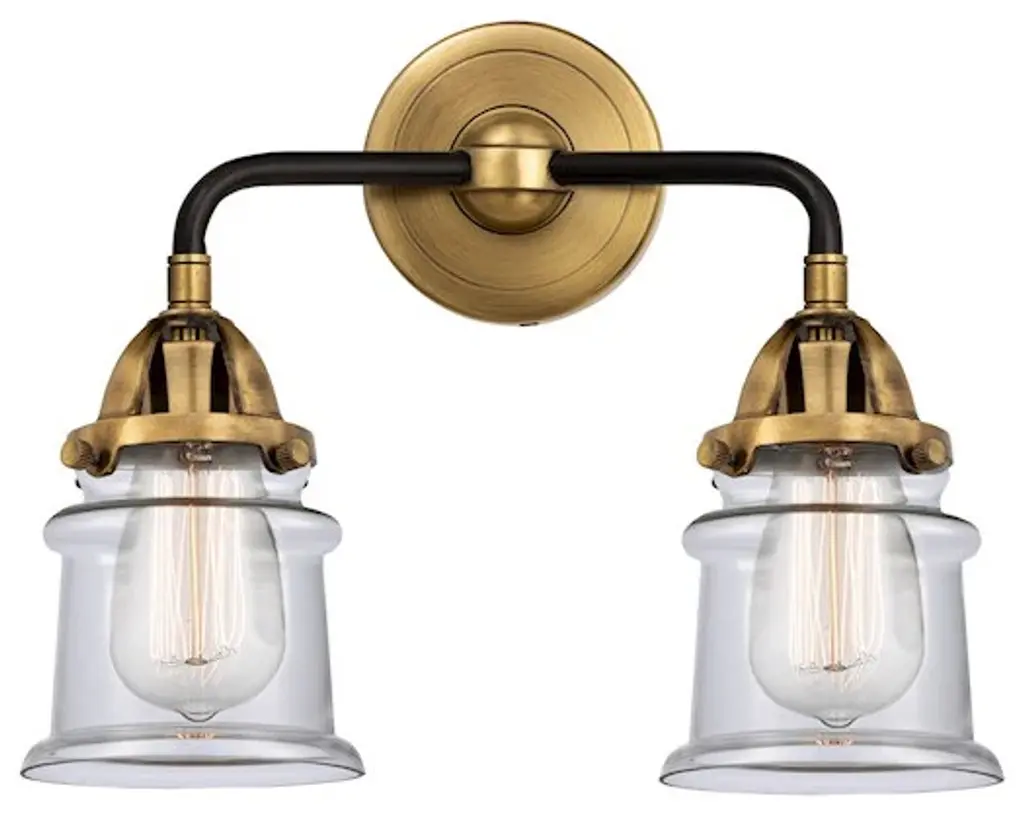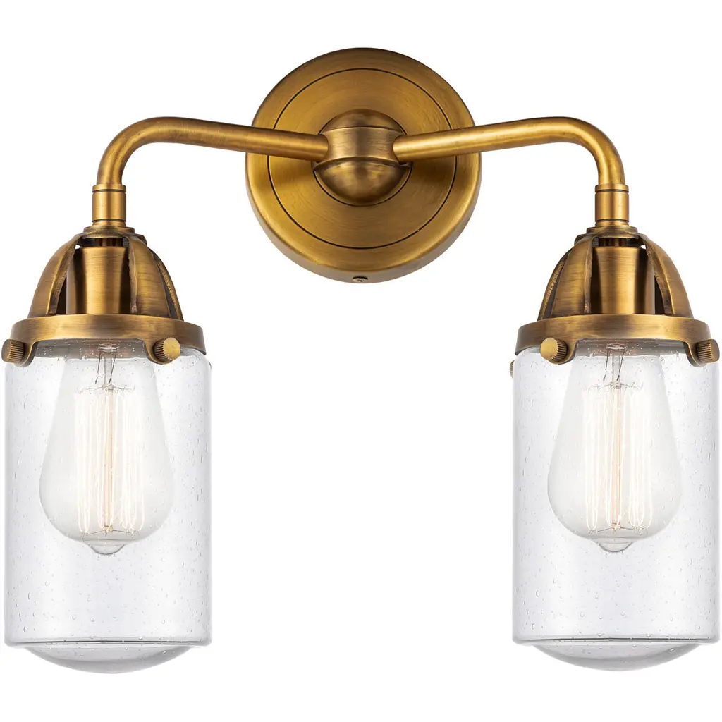 Innovations Lighting 288-2W-BB-G312-LED Dover 2 Light 12.5" Bath Vanity Light. Style: Transitional, Industrial, Restoration-Vintage. Collection: Nouveau 2. Material: Steel, Cast Brass, Glass. Metal Finish(Body): Brushed Brass. Metal Finish(Canopy/Backplate): Brushed Brass. Dimension(in): 12.875(H) x 12.5(W) x 6.5(Ext). Bulb: (2)3.5 Watt LED Vintage Medium Base Bulb Included. Voltage: 120. Dimmable: Yes. Color Temperature: 2700. CRI: 82. Lumens: 350. Maximum Wattage Per Socket: 100. Glass Shade Description: Clear Dover. Shade Material: Glass. Glass or Metal Shade Color: Clear. Glass Type: Transparent . Shade Size Dimension(in): 4.5(Dia) x 6.5(H). Shade Fitter Measurement: 3.25" Fitter. Canopy Dimension(in): 4.5(Dia). Backplate Dimenison(in): 4.5(Dia) x 0.75(Depth). UL and ETL Certification: Damp Location.