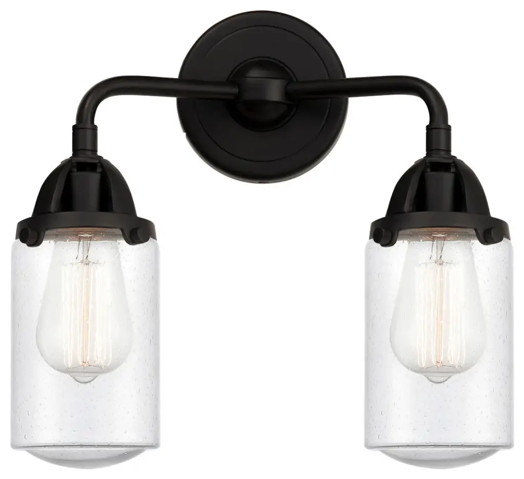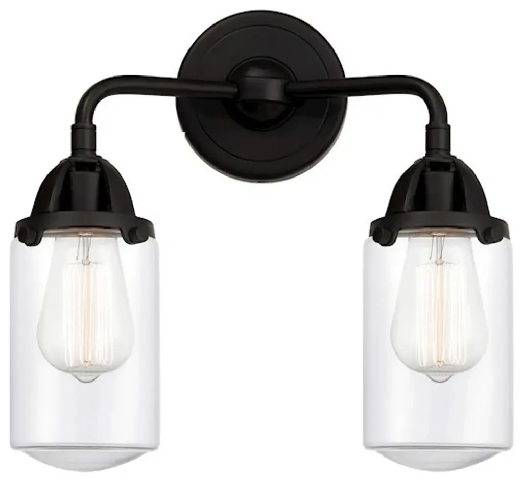 Innovations Lighting 288-2W-BK-G182-LED Canton 2 Light 14" Bath Vanity Light. Style: Transitional, Industrial, Farmhouse, Seaside, Restoration-Vintage. Collection: Nouveau 2. Material: Steel, Cast Brass, Glass. Metal Finish(Body): Matte Black. Metal Finish(Canopy/Backplate): Matte Black. Dimension(in): 13.625(H) x 14(W) x 7.25(Ext). Bulb: (2)3.5 Watt LED Vintage Medium Base Bulb Included. Voltage: 120. Dimmable: Yes. Color Temperature: 2700. CRI: 82. Lumens: 350. Maximum Wattage Per Socket: 100. Glass Shade Description: Clear Canton. Shade Material: Glass. Glass or Metal Shade Color: Clear. Glass Type: Transparent . Shade Size Dimension(in): 6(Dia) x 7.25(H). Shade Fitter Measurement: 3.25" Fitter. Canopy Dimension(in): 4.5(Dia). Backplate Dimenison(in): 4.5(Dia) x 0.75(Depth). UL and ETL Certification: Damp Location.