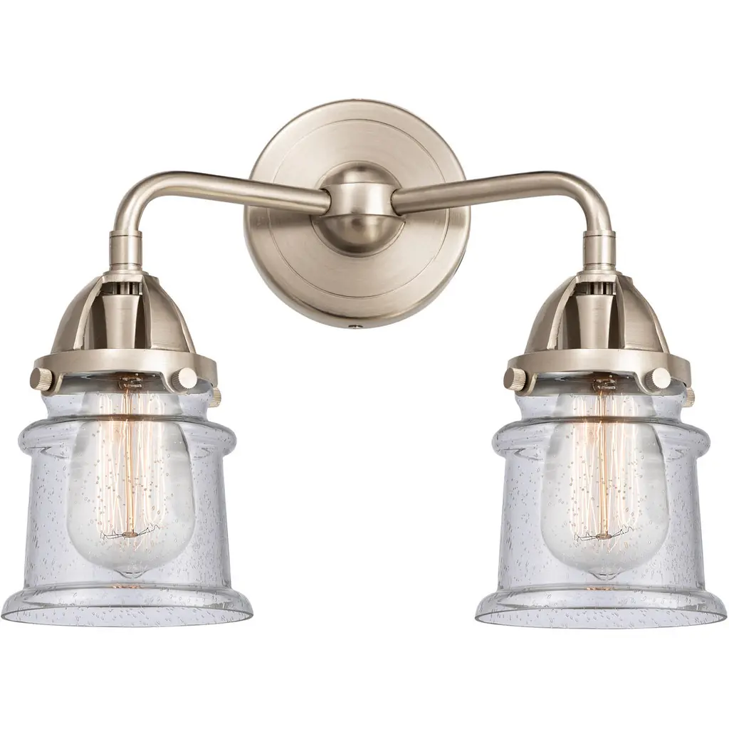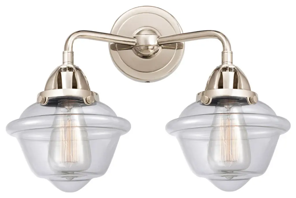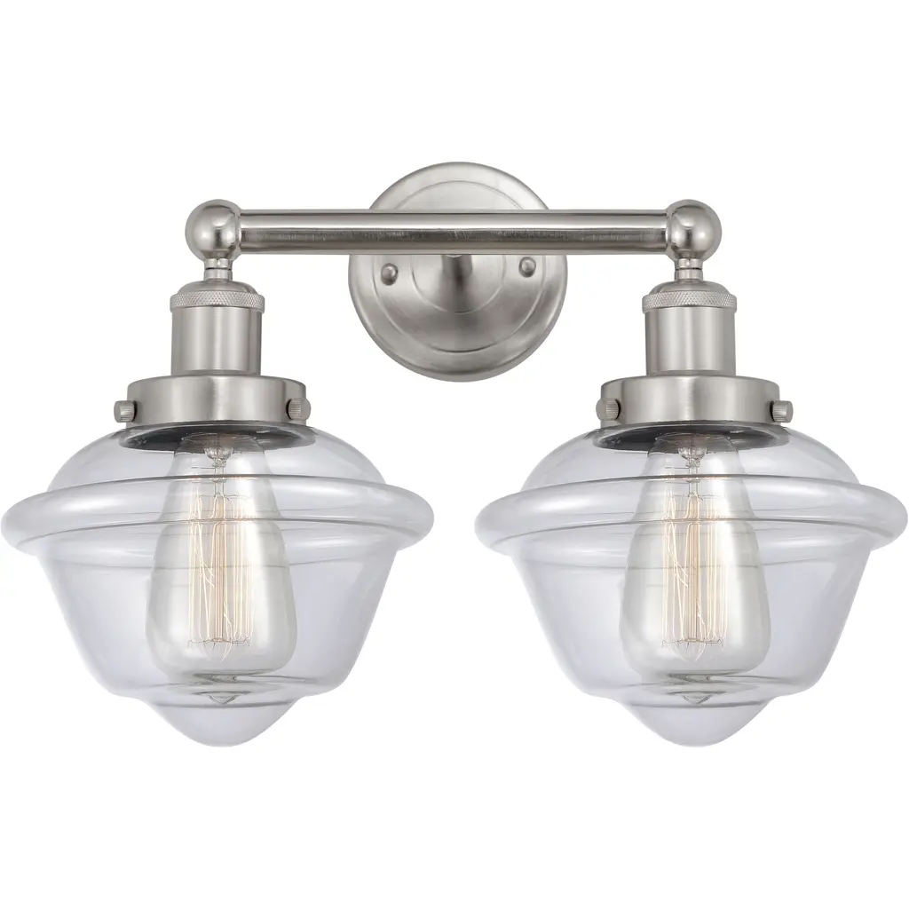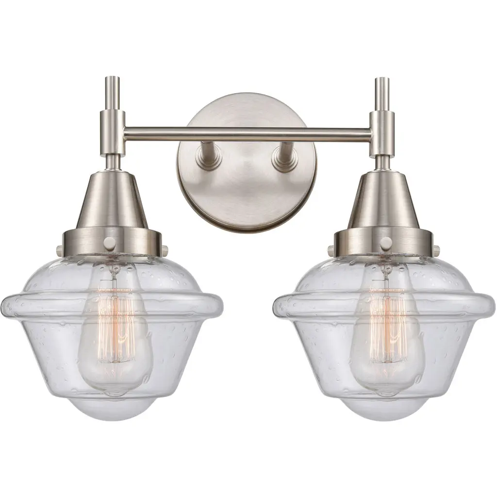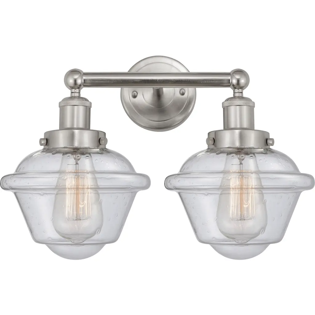 Innovations Lighting 288-2W-SN-G534-LED Small Oxford 2 Light 15.5" Bath Vanity Light. Style: Transitional, Industrial, Restoration-Vintage. Collection: Nouveau 2. Material: Steel, Cast Brass, Glass. Metal Finish(Body): Brushed Satin Nickel. Metal Finish(Canopy/Backplate): Brushed Satin Nickel. Dimension(in): 12.125(H) x 15.5(W) x 8(Ext). Bulb: (2)3.5 Watt LED Vintage Medium Base Bulb Included. Voltage: 120. Dimmable: Yes. Color Temperature: 2700. CRI: 82. Lumens: 350. Maximum Wattage Per Socket: 100. Glass Shade Description: Seedy Small Oxford. Shade Material: Glass. Glass or Metal Shade Color: Seedy. Glass Type: Seeded. Shade Size Dimension(in): 7.5(Dia) x 5.75(H). Shade Fitter Measurement: 3.25" Fitter. Canopy Dimension(in): 4.5(Dia). Backplate Dimenison(in): 4.5(Dia) x 0.75(Depth). UL and ETL Certification: Damp Location.