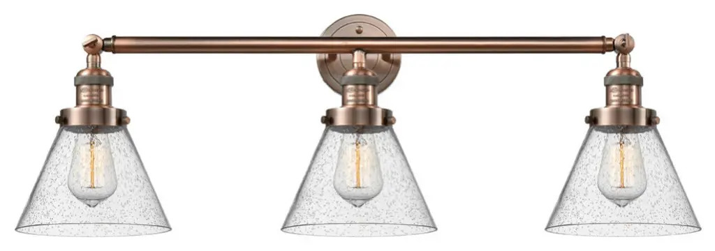 Innovations Lighting 288-3W-AC-G182-LED Canton 3 Light 24" Bath Vanity Light. Style: Transitional, Industrial, Farmhouse, Seaside, Restoration-Vintage. Collection: Nouveau 2. Material: Steel, Cast Brass, Glass. Metal Finish(Body): Antique Copper. Metal Finish(Canopy/Backplate): Antique Copper. Dimension(in): 11.625(H) x 24(W) x 7.25(Ext). Bulb: (3)3.5 Watt LED Vintage Medium Base Bulb Included. Voltage: 120. Dimmable: Yes. Color Temperature: 2700. CRI: 82. Lumens: 350. Maximum Wattage Per Socket: 100. Glass Shade Description: Clear Canton. Shade Material: Glass. Glass or Metal Shade Color: Clear. Glass Type: Transparent . Shade Size Dimension(in): 6(Dia) x 7.25(H). Shade Fitter Measurement: 3.25" Fitter. Canopy Dimension(in): 4.5(Dia). Backplate Dimenison(in): 4.5(Dia) x 0.75(Depth). UL and ETL Certification: Damp Location.