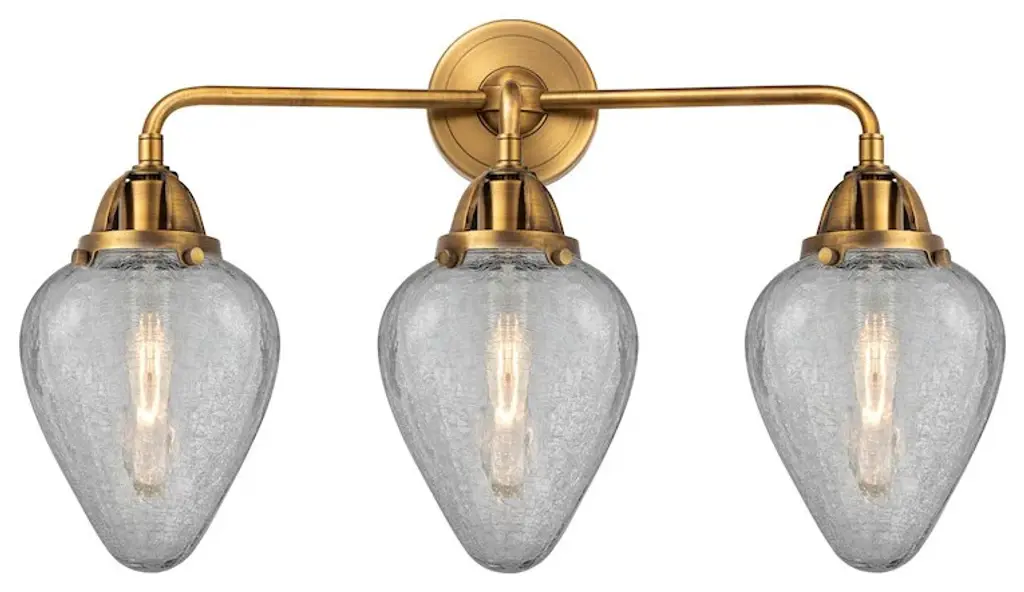 Innovations Lighting 288-3W-BB-G142-LED Chatham 3 Light 24" Bath Vanity Light. Style: Art Deco, Industrial, Restoration-Vintage, Rustic, Shabby Chic, Victorian. Collection: Nouveau 2. Material: Steel, Cast Brass, Glass. Metal Finish(Body): Brushed Brass. Metal Finish(Canopy/Backplate): Brushed Brass. Dimension(in): 10.125(H) x 24(W) x 7.25(Ext). Bulb: (3)3.5 Watt LED Vintage Medium Base Bulb Included. Voltage: 120. Dimmable: Yes. Color Temperature: 2700. CRI: 82. Lumens: 350. Maximum Wattage Per Socket: 100. Glass Shade Description: Clear Chatham. Shade Material: Glass. Glass or Metal Shade Color: Clear. Glass Type: Transparent; Ribbed. Shade Size Dimension(in): 6(Dia) x 5.75(H). Shade Fitter Measurement: 3.25" Fitter. Canopy Dimension(in): 4.5(Dia). Backplate Dimenison(in): 4.5(Dia) x 0.75(Depth). UL and ETL Certification: Damp Location.