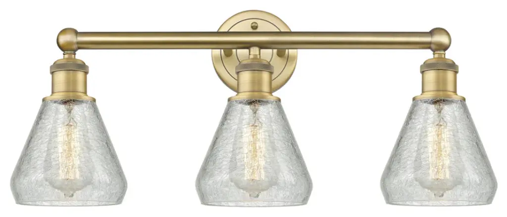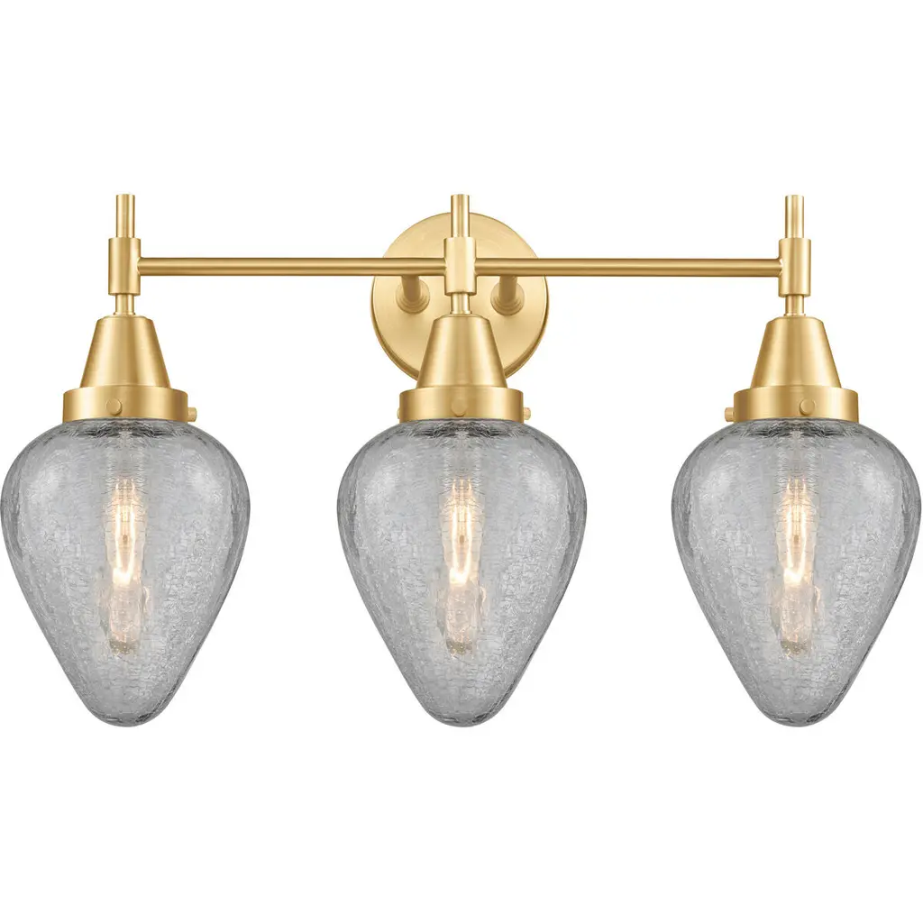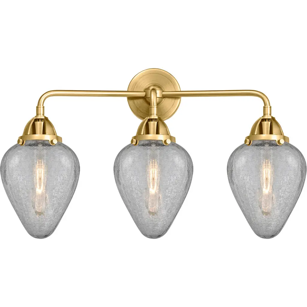 Innovations Lighting 288-3W-BB-G165 Geneseo 3 Light 24.5" Bath Vanity Light. Style: Transitional, Industrial, Restoration-Vintage. Collection: Nouveau 2. Material: Steel, Cast Brass, Glass. Metal Finish(Body): Brushed Brass. Metal Finish(Canopy/Backplate): Brushed Brass. Dimension(in): 13.125(H) x 24.5(W) x 7.5(Ext). Bulb: (3)60W Medium Base Vintage Bulb recommended(Not Included). Voltage: 120. Dimmable: Yes. Color Temperature: 2200. CRI: 99.9. Lumens: 220. Maximum Wattage Per Socket: 100. Glass Shade Description: Clear Crackle Geneseo. Shade Material: Glass. Glass or Metal Shade Color: Clear Crackled. Glass Type: Crackled. Shade Size Dimension(in): 6.5(Dia) x 8.75(H). Shade Fitter Measurement: 3.25" Fitter. Canopy Dimension(in): 4.5(Dia). Backplate Dimenison(in): 4.5(Dia) x 0.75(Depth). UL and ETL Certification: Damp Location.