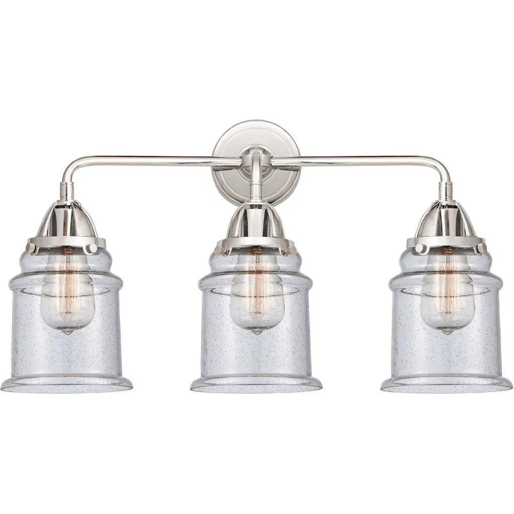 Innovations Lighting 288-3W-PN-G182-LED Canton 3 Light 24" Bath Vanity Light. Style: Transitional, Industrial, Farmhouse, Seaside, Restoration-Vintage. Collection: Nouveau 2. Material: Steel, Cast Brass, Glass. Metal Finish(Body): Polished Nickel. Metal Finish(Canopy/Backplate): Polished Nickel. Dimension(in): 11.625(H) x 24(W) x 7.25(Ext). Bulb: (3)3.5 Watt LED Vintage Medium Base Bulb Included. Voltage: 120. Dimmable: Yes. Color Temperature: 2700. CRI: 82. Lumens: 350. Maximum Wattage Per Socket: 100. Glass Shade Description: Clear Canton. Shade Material: Glass. Glass or Metal Shade Color: Clear. Glass Type: Transparent . Shade Size Dimension(in): 6(Dia) x 7.25(H). Shade Fitter Measurement: 3.25" Fitter. Canopy Dimension(in): 4.5(Dia). Backplate Dimenison(in): 4.5(Dia) x 0.75(Depth). UL and ETL Certification: Damp Location.