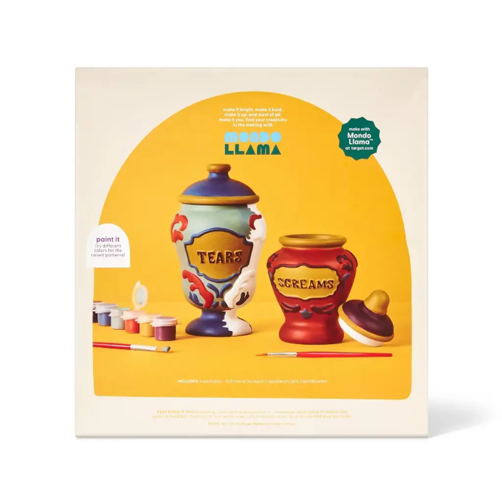 Bring your emotions out this Halloween with the 2-Count Halloween Craft Ceramic Apothecary Jars Painting Kit from Mondo Llama™. This painting kit includes two paintbrushes, two paint pots and two apothecary jars to help you showcase your creativity. The jars feature the message "Tears" on one and "Screams" on the other. Great for your own or gifting, the painting kit makes a beautiful addition to your seasonal decor. Mondo Llama™: Find your creativity in the making.