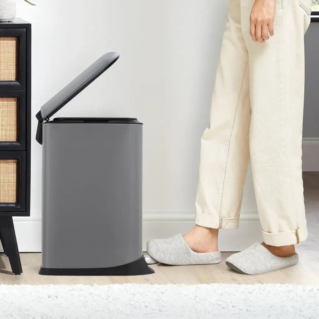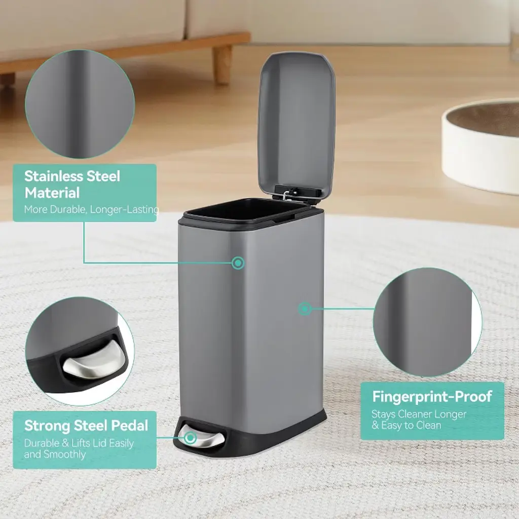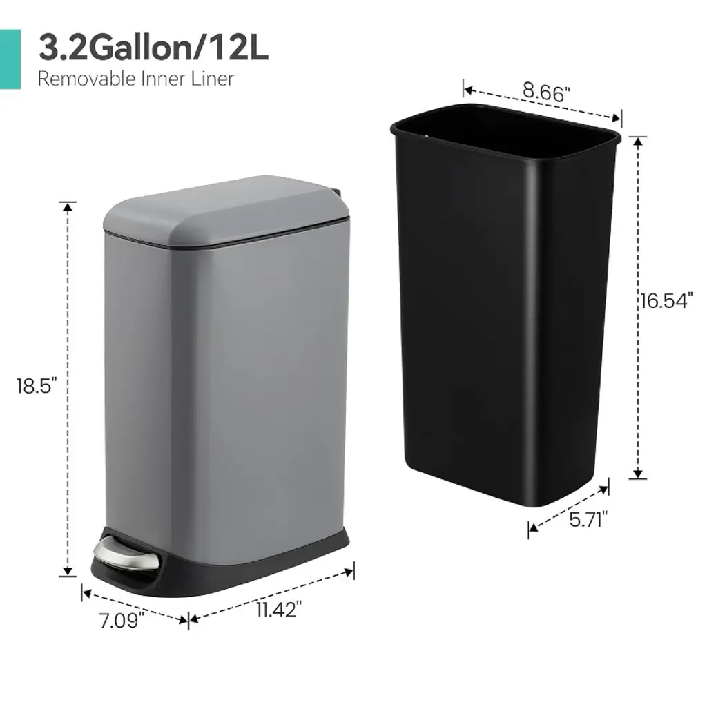 【Compact and Convenient Size】This 12 liter / 3.2 gallon trash can is perfect for both small kitchens and bathrooms, fitting seamlessly into any corner or tight space. Its compact design makes it an ideal choice for those who need a reliable kitchen trash can without sacrificing valuable floor space. 【Fingerprint-Resistant Finish】Crafted from high-quality stainless steel, this kitchen trash can features a fingerprint-resistant coating, ensuring that it stays clean and smudge-free. This durable finish not only adds elegance but also makes it a practical kitchen garbage can, saving you time on maintenance and cleaning. 【Soft Close Lid with Step-On Pedal】The trash can's lid is equipped with a soft-close mechanism, allowing it to shut quietly without slamming. The convenient step-on pedal offers hands-free operation, making this an excellent trash can kitchen solution for busy households or when your hands are full. 【Versatile for Kitchen or Bathroom】Designed as both a kitchen trash can 3.2 gallon and a bathroom garbage can, it offers versatility and style wherever it is placed. Whether you need a trash can with lid for the kitchen or a small, efficient waste bin for the bathroom, this product meets a variety of needs. The trash can comes with a sturdy plastic inner bucket, making trash disposal and bag replacement easy and mess-free. The inner bucket's robust construction ensures it stands up to daily use, providing long-lasting functionality as a reliable kitchen trash can 3.2 gallon. 【Sleek and Modern Design】With its sleek stainless steel exterior and modern design, this trash can complements any home decor, adding a touch of sophistication to your space. Its stylish appearance makes it a perfect addition to your collection of kitchen trash cans, enhancing the overall look of your kitchen or bathroom.