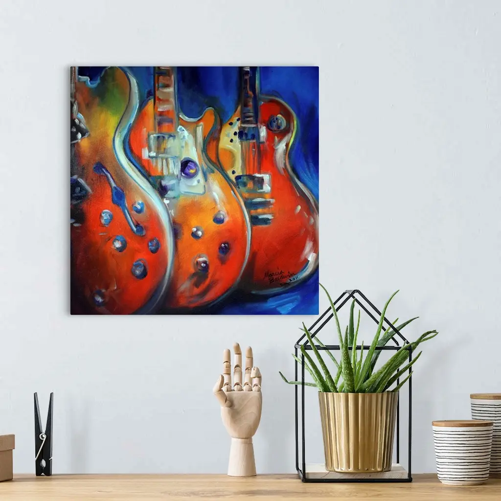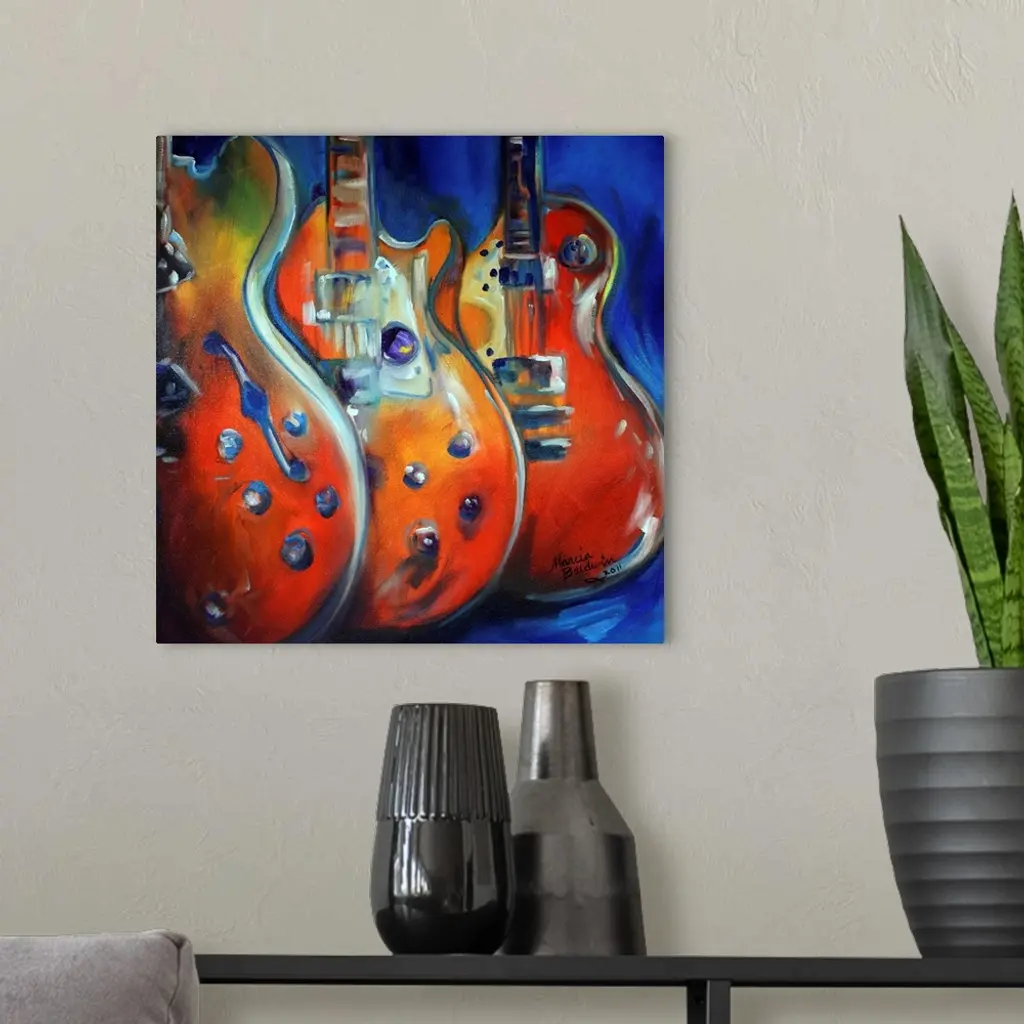 Square painting in red, blue, yellow, orange, and green hues of three guitars standing up in a row.