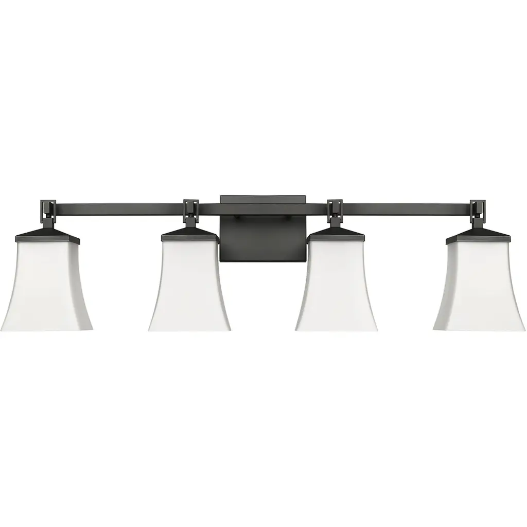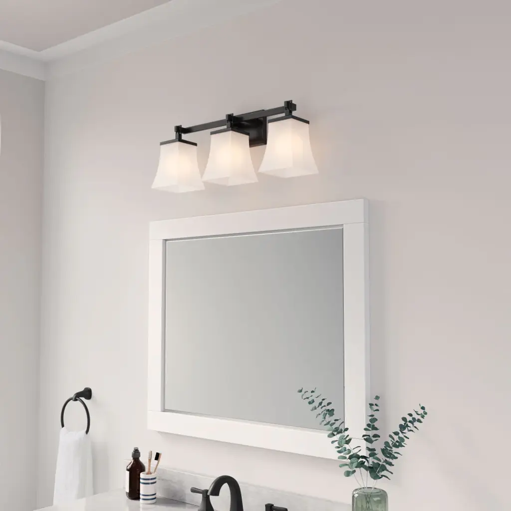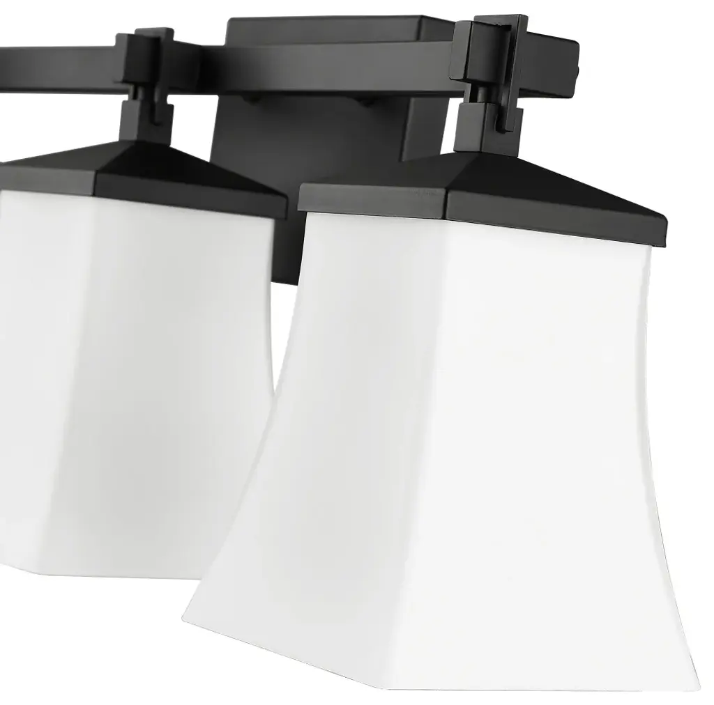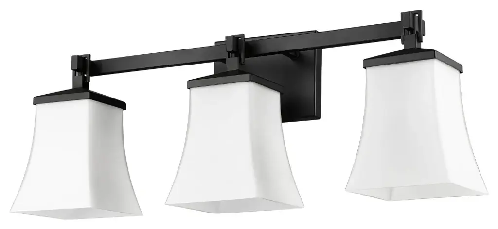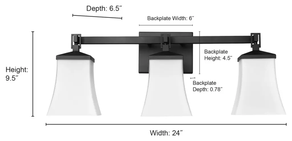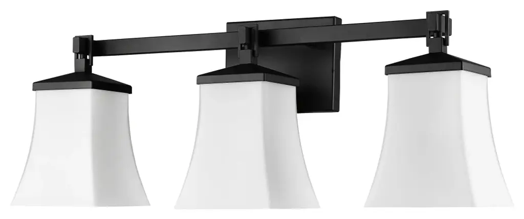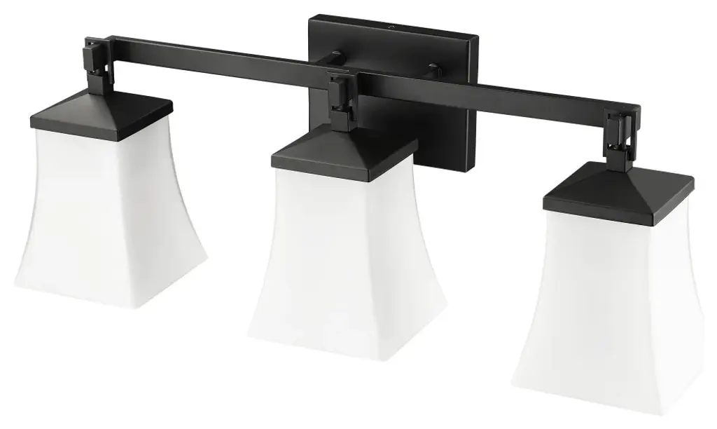 The Sonorra Family of vanity lighting combines modern styling with classic Arts and Crafts movement design details. Perfect for interiors from Asian inspired to ultra-modern, the square, white frosted glass globes are enhanced by stylish hooks and clean, angular lines of the fixture. These 1-light, 2-light, and 3-light vanity lamps are in matte black. Key Features: Height: 9-1/2"Width: 24"Extension: 6-1/2"Product Weight: 8.091 lbsShade Height: 6-1/4"Backplate Height: 4-1/2"Backplate Width: 6"Backplate Depth: 3/4"Max Wattage: 180 wattsNumber of Bulbs: 3Watts Per Bulb: 60 wattsBulb Base: Medium (E26)Voltage: 120 voltsBulb Included: No