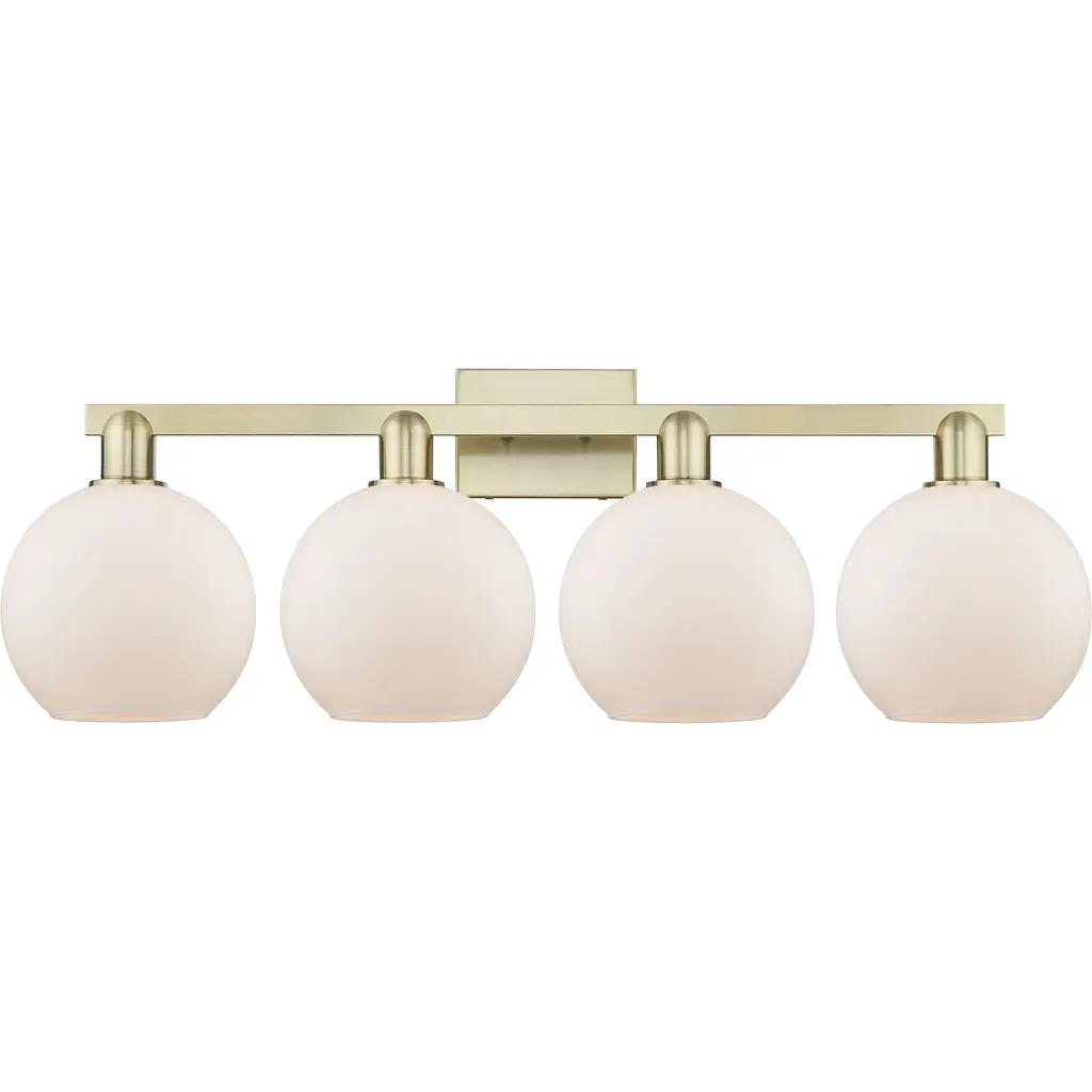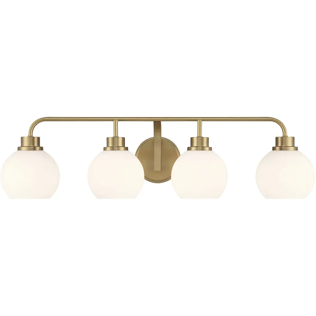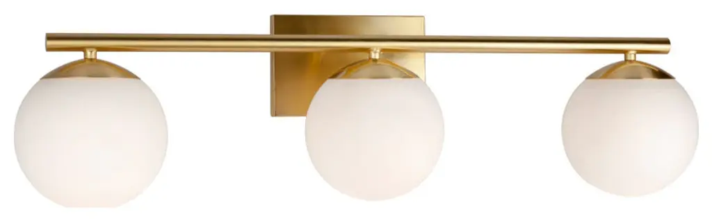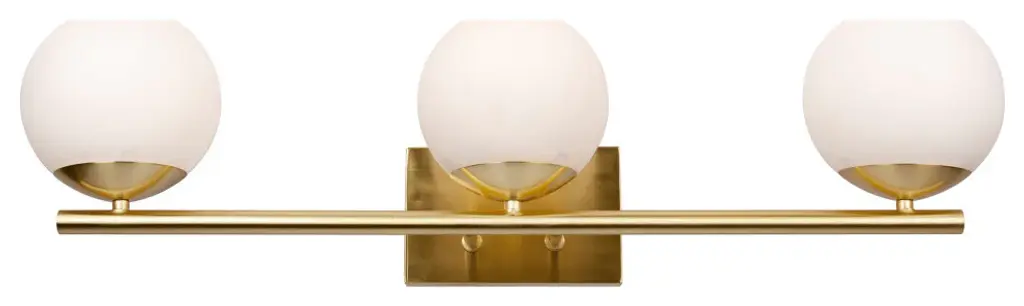 This Farrell vanity light compliments nicely with both contemporary and transitional decor homes. The smooth tubing and glass holders along with the rectangular backplate complete the simplistic look for your bath. These gold finish steel fixtures are accented with satin opal glass globes completing the look. This 3-light vanity fixture measures 30 in. L x 7 in. D x 8 in. H.. Medium Base Bulb, 60W max per bulb. This fixture is hardwired. Bulbs are not included with the fixture.