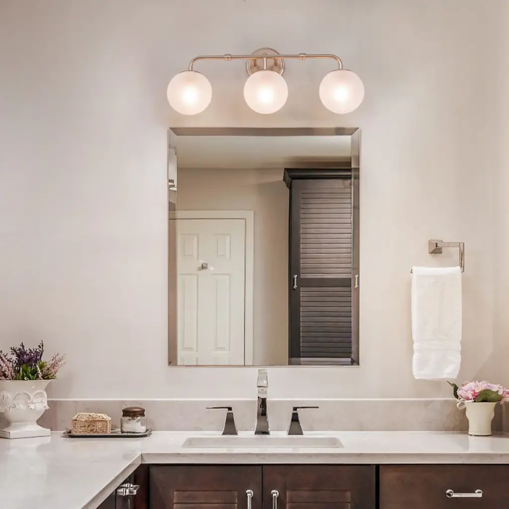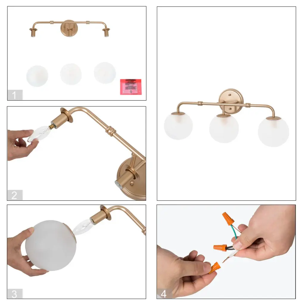 This gold wall lighting combines gold and white, with globe glass shades like cute eggshells. The simple but classic design will be perfect for a modern/contemporary room. With this vanity light, your room will be coated with soft and beautiful lights, and with our [5-Year Warranty and Free Accessory Replacement], we can ensure your complete satisfaction with your purchase. This golden modern bathroom lamp will be a bright element in your room. Frosted glass shade makes soft light.Uses (3) max 40-Watt E12/candelabra base bulbs (not included)Long-Term Warranty and Timely Customer Support are providedMODERN/CONTEMPORARY: With matte gold rods and white frosted glass, this modern vanity light will bring a dreamy and gentle light to your bathroomWIDE APPLICATION: The bathroom vanity light fixture can be installed as either an up-light or a downlightBULB REQUIREMENT: This globe vanity light requires (3) max 40-Watt E12 candelabra base Incandescent/LED bulbs (not included)2-DIRECTIONS: Can be displayed individually or in groups of 2 Mount on a wall on either side of a mirror to eliminate shadows on the face when getting ready for the day or for a night outDIMENSIONS: this linear bathroom vanity light size at 24.5 -in H x 7.5-in W x 10-in H, backplate size: 5 inches; Glass shape: 7.5-in DUL LISTED AND DURABLE: For safe use, this globe wall light is UL-Listed for dry locations, sturdy metal construction is built to last and offers a clean, polished look