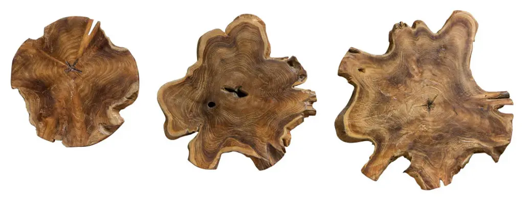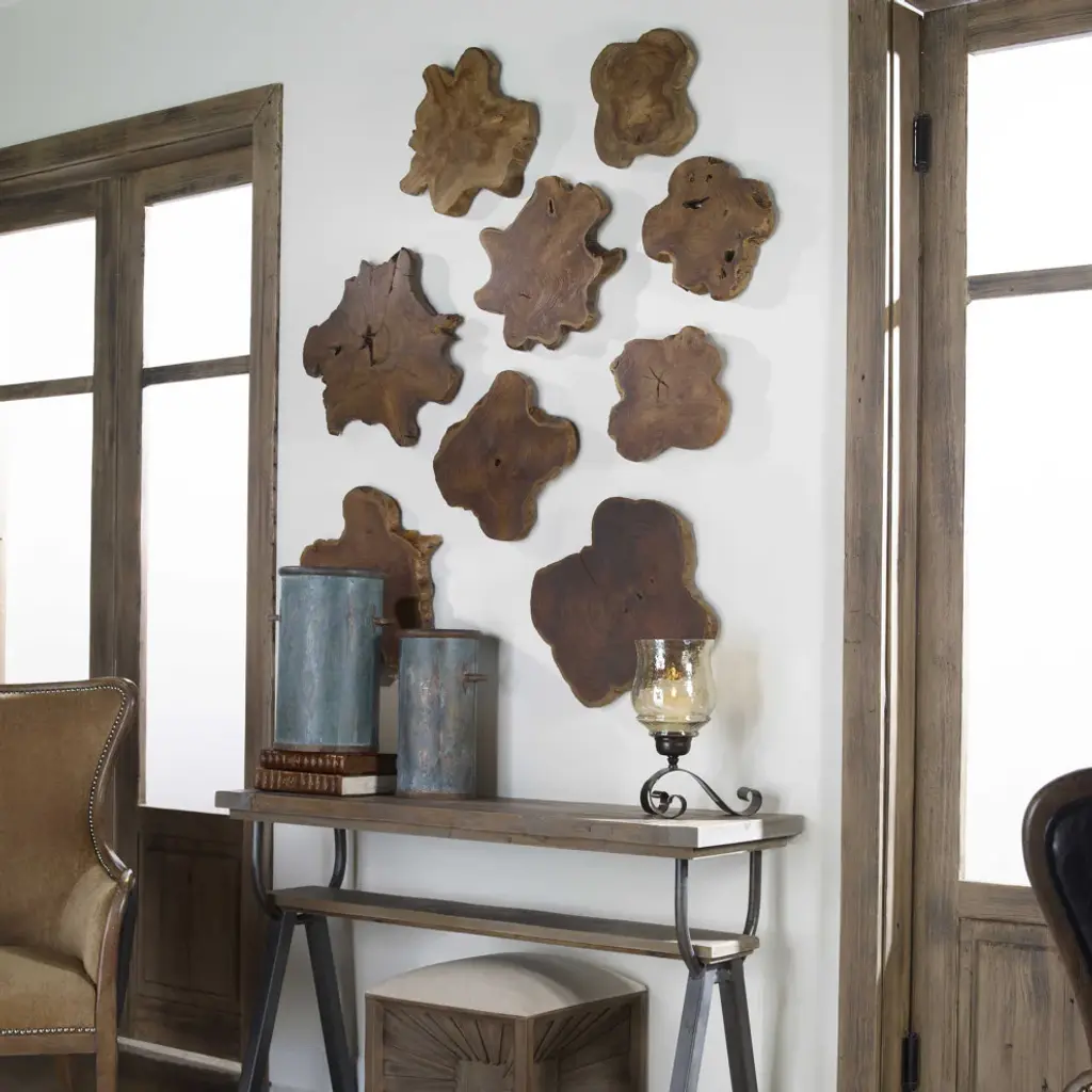 Deeply Grained Cross Sections Of Natural Teak Wood With A Light Honey Glazing. Panels May Be Hung Or Used As Tabletop Accessories. Sizes And Grain Pattern May Vary Due To The Authentic Nature.- Sizes are approximate due to natural materials. Includes one of each size: Lg - 20" dia; Med - 16" dia; Sm: 12" dia. Each approximately 1" deep.- Natural Teak Wood with Metal Hardware- Natural Finish. Group multiple sets together for a truly stunning look.- Heirloom Quality - Expertly hand crafted and hand finished. Due to the hand crafted nature of this piece, each piece may have subtle differences.