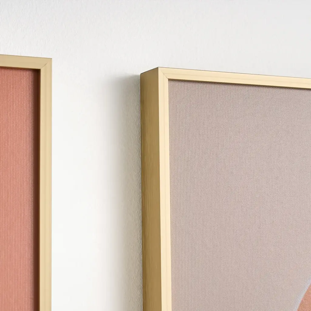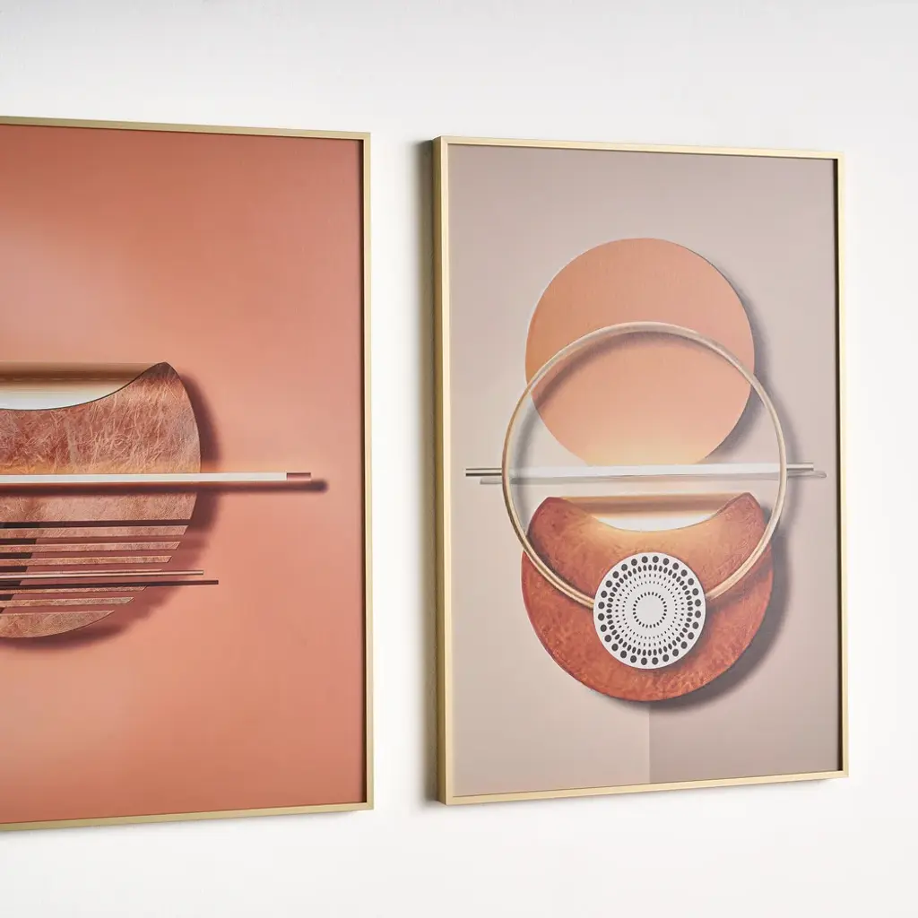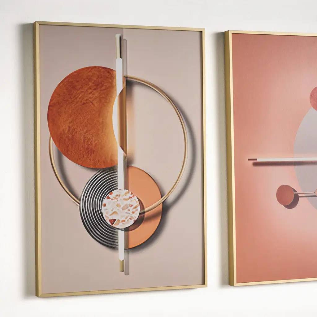 Set the tone for an eclectic living room with this triptych, depicting three abstract geometry images. Showcasing bold brushstrokes of gold, orange, and other color, this set pairs well with any aesthetic, from modern to industrial and beyond. Each is set in gold frame for even more modern appeal.