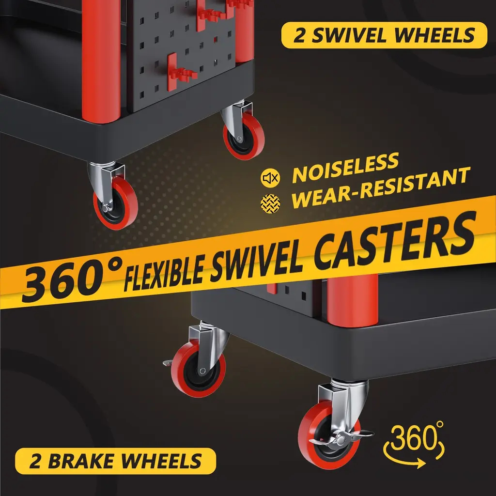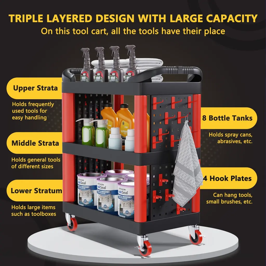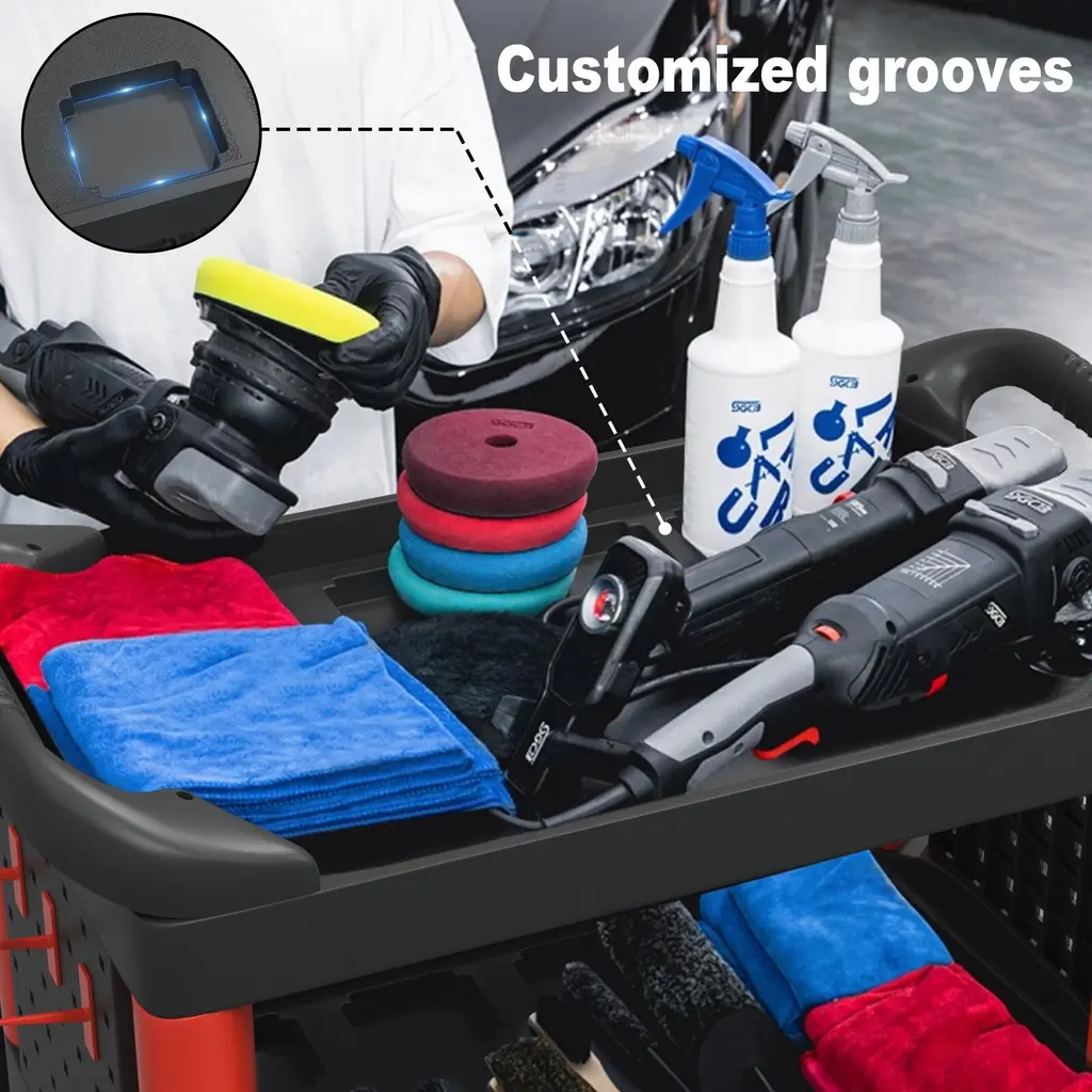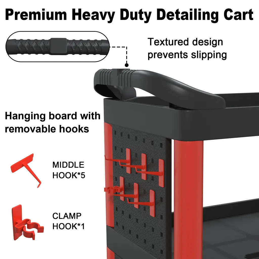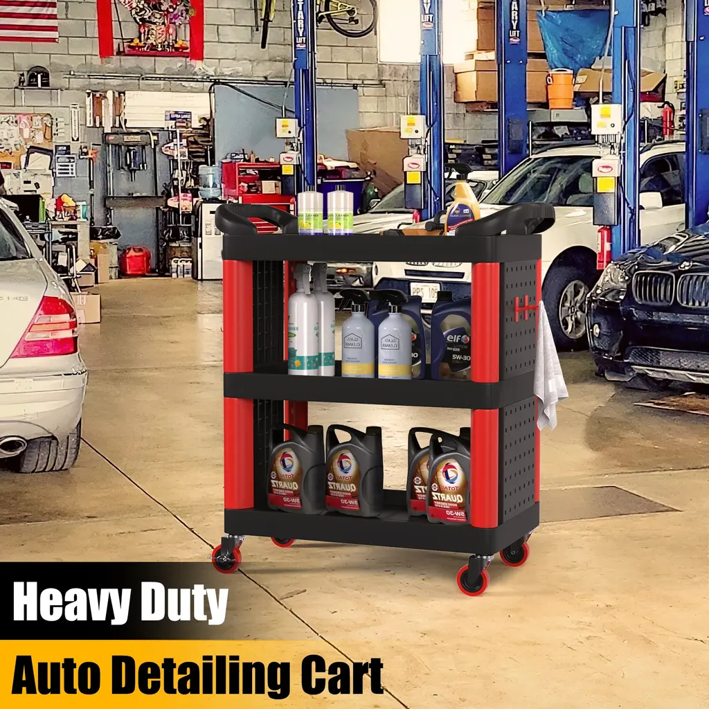 3 Tier Auto Detailing Tool Cart With Wheels Wash Detail Trolley - Red/black