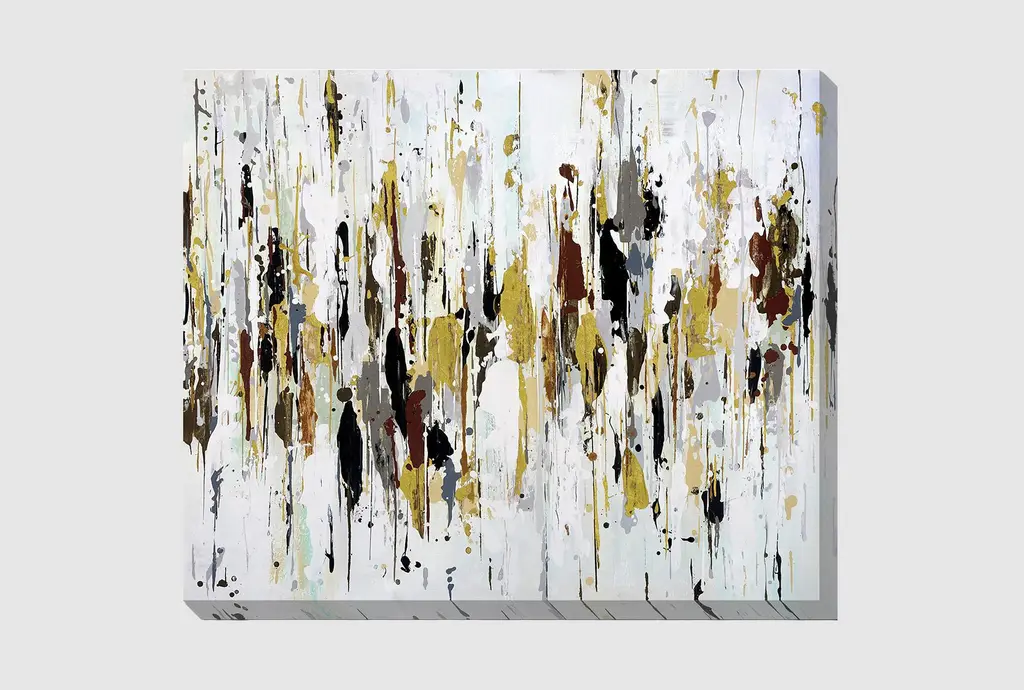This 30"x40" multicolor modern abstract canvas art is skillfully framed with a gold frame, providing a stunning addition to any contemporary space. The horizontal orientation and blend of gold, white, brown, and black colors create a visually striking piece that complements a variety of decor styles. The combination of canvas, wood, and polystyrene materials ensures durability and a high-quality finish.