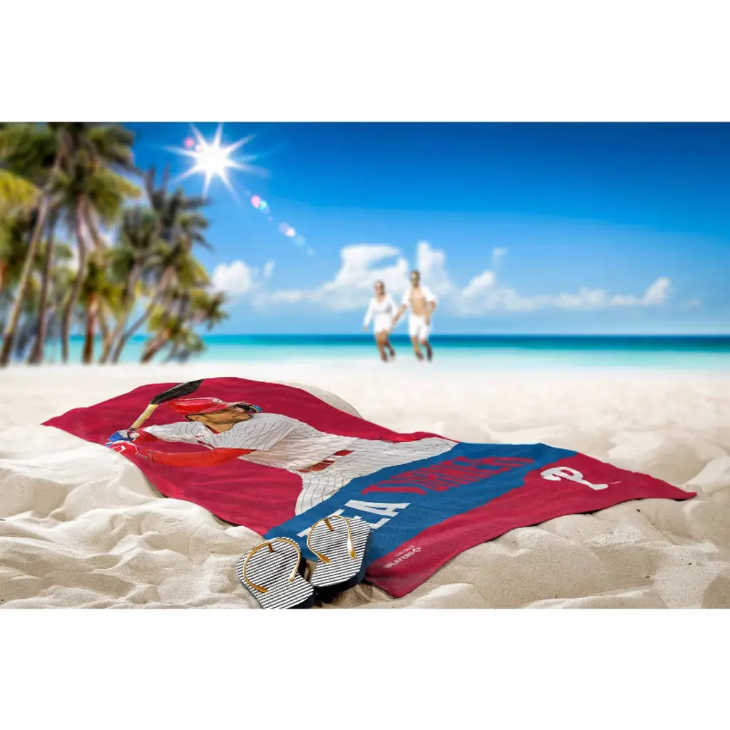 Show off your team spirit at the pool or beach with our Officially Licensed MLB Player Beach Towel! The generously sized soft and absorbent 30 x 60 inches towel features your favorite MLB player in an action pose with his name, logo and team colors, making it a must-have for any fan. Perfect for drying off after a swim or lounging in the sun. Grab your sunscreen, pack your bag, and head out to the water with your new favorite MLB player beach towel!