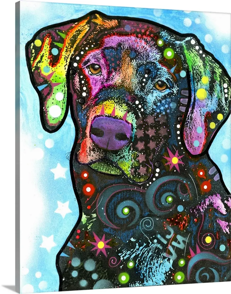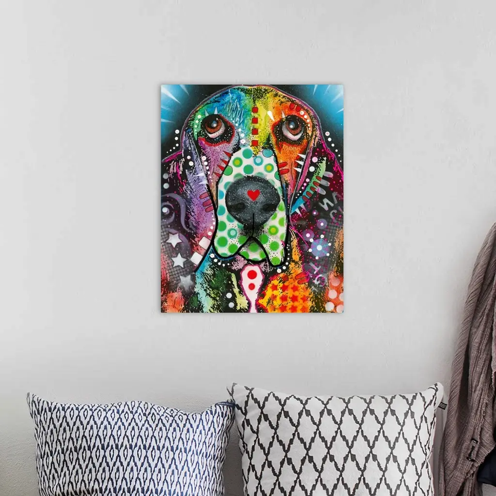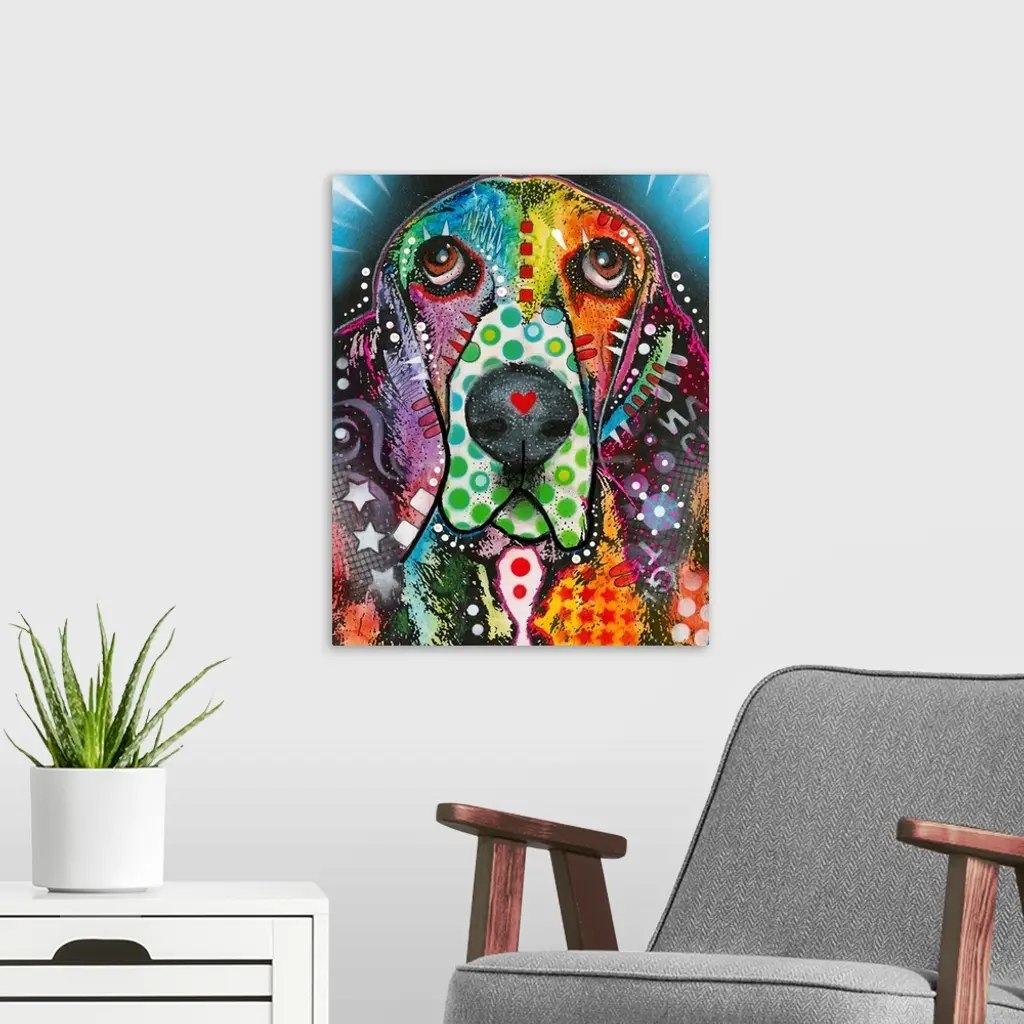 Graffiti style painting of a Hound Dog with different colors and abstract designs all over.