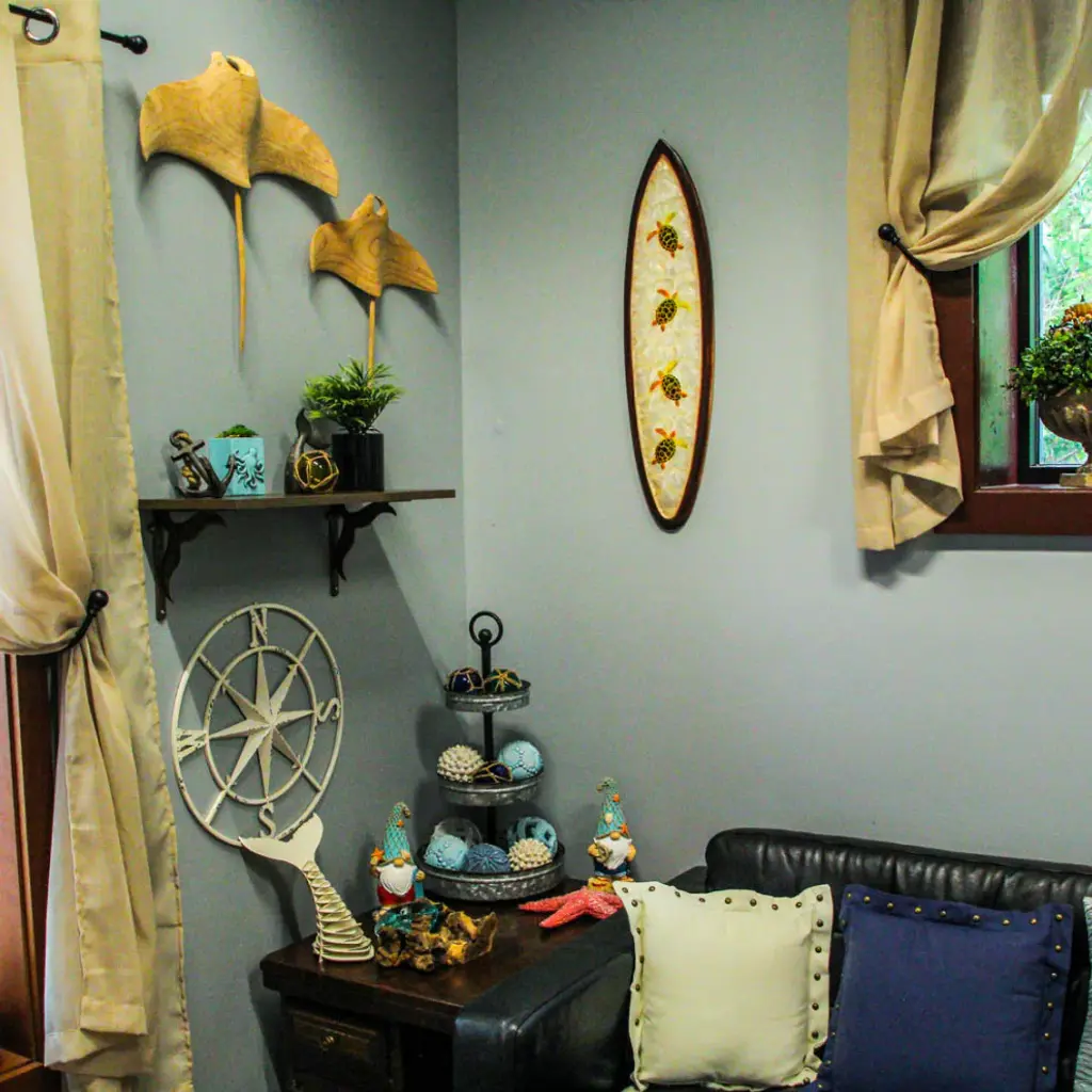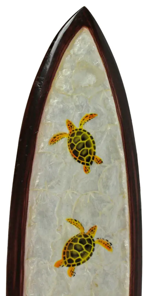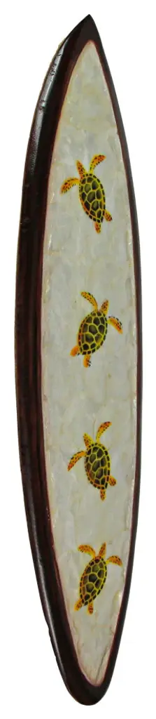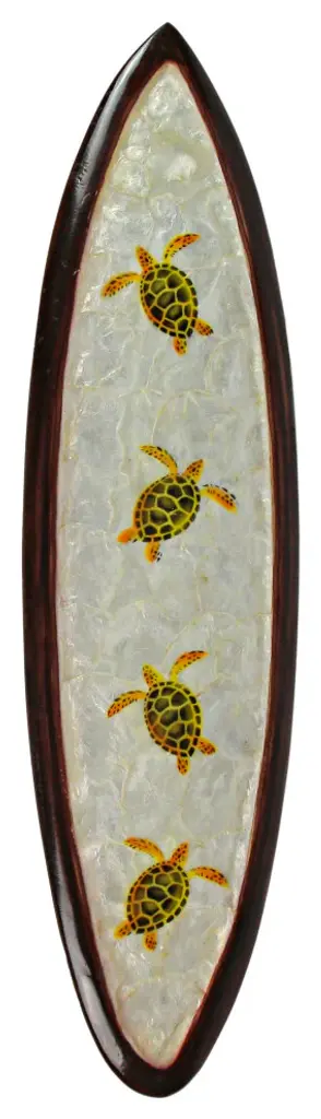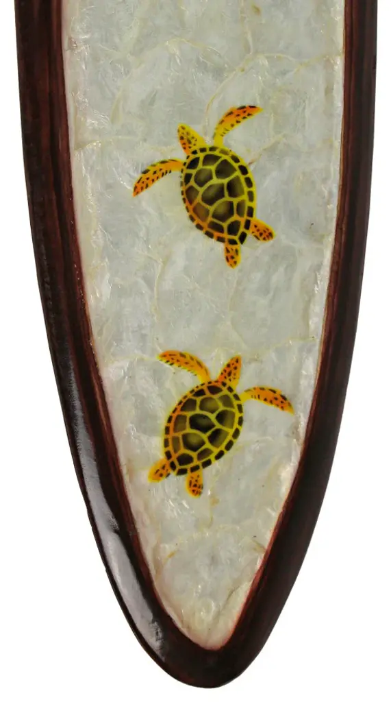 Generous Dimensions - Measures 8 inches long, 0.5 inches wide, and 31.5 inches high, providing a noticeable and appealing presence on your wall.Eco-Friendly Craftsmanship - Crafted from sustainable and easily renewable Acacia wood, ensuring both durability and environmental consciousness.Artisanal Excellence - Each piece is hand-carved, making it unique and distinctly crafted, and hand-painted to enhance its coastal charm.Perfect Coastal Accent - Ideal as a centerpiece or accent in your living room, kitchen, or bedroom, infusing a beachy vibe into your decor.Effortless Display - Equipped with built-in rope hangers, allowing for quick and simple setup, transforming your space into a coastal retreat effortlessly.Embrace the laid-back vibes of the beach with this hand-carved decorative surfboard, an ideal adornment for surf enthusiasts and lovers of coastal aesthetics. Crafted from sustainable Acacia wood, it boasts capiz shell accents and a captivating depiction of four sea turtles at its center. Individually crafted by skilled artisans in Indonesia, this surfboard measures 8 inches long, 0.5 inches wide, and 31.5 inches high, making it a standout piece of beachy decor. The surfboard''s cool and casual design captures the essence of beach life, instantly transforming any room into a seaside paradise. Its pre-installed D-ring hanger on the back ensures effortless wall mounting, allowing you to effortlessly infuse your space with coastal charm. This decorative piece not only adds a touch of surf culture to your home but also represents eco-consciousness, being made from renewable materials. Whether displayed in your living room, bedroom, or any other space, this surfboard brings the spirit of the beach into your home, reminding you of the soothing waves and carefree atmosphere of coastal living.