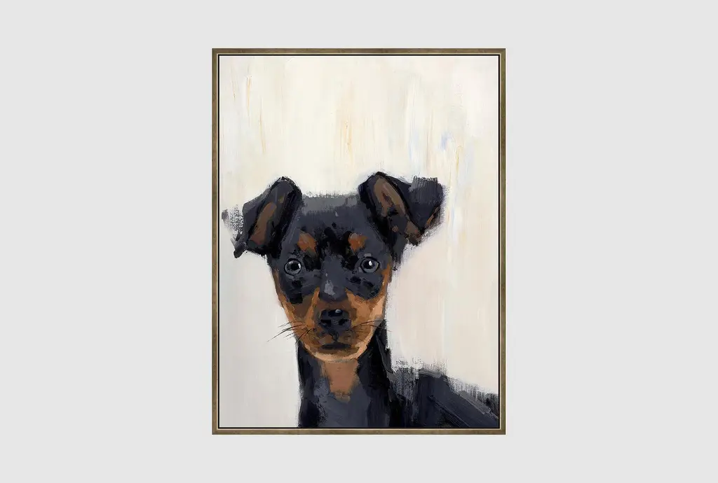 Bring a touch of rustic charm to your home with the Min Pin Framed Canvas Art. This striking piece features an animal print in a vertical rectangle orientation, perfect for adding personality to any room. The espresso frame beautifully complements the black and brown tones of the canvas.