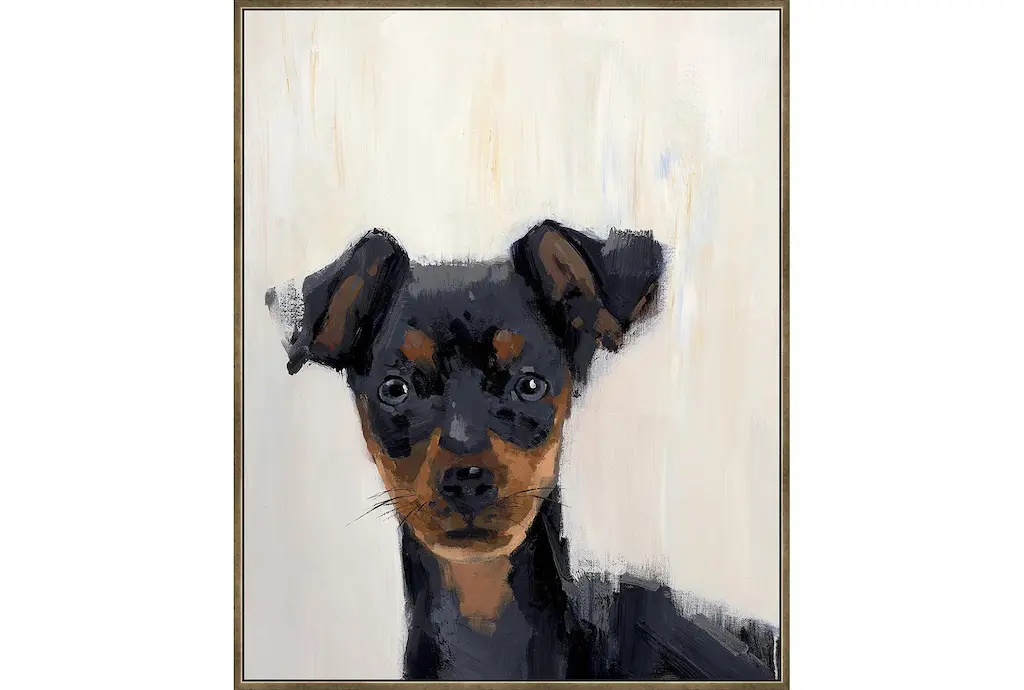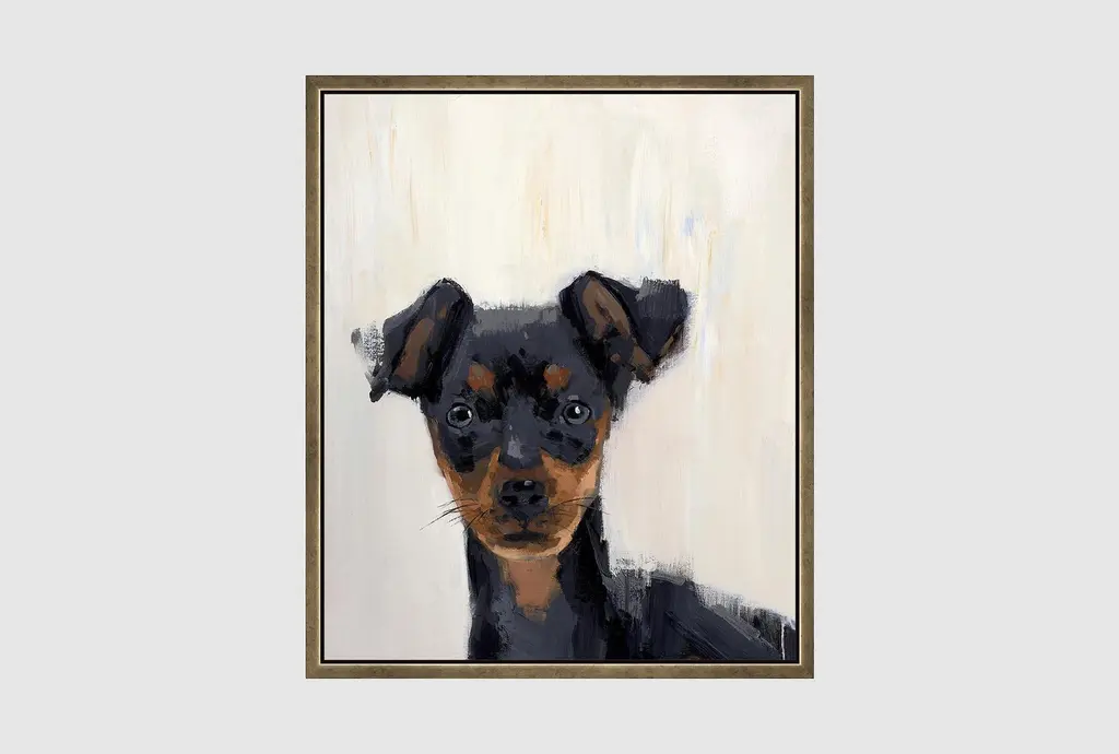 The 32X42 Min Pin With Black Frame is a stunning piece of framed canvas art that will add charm to any room. Featuring a rustic style, this vertical rectangle print is designed with a multicolor animal theme that is perfect for kids' rooms. Made in the USA with high-quality materials, this artwork combines canvas, wood, and polystyrene for a durable and eye-catching display.