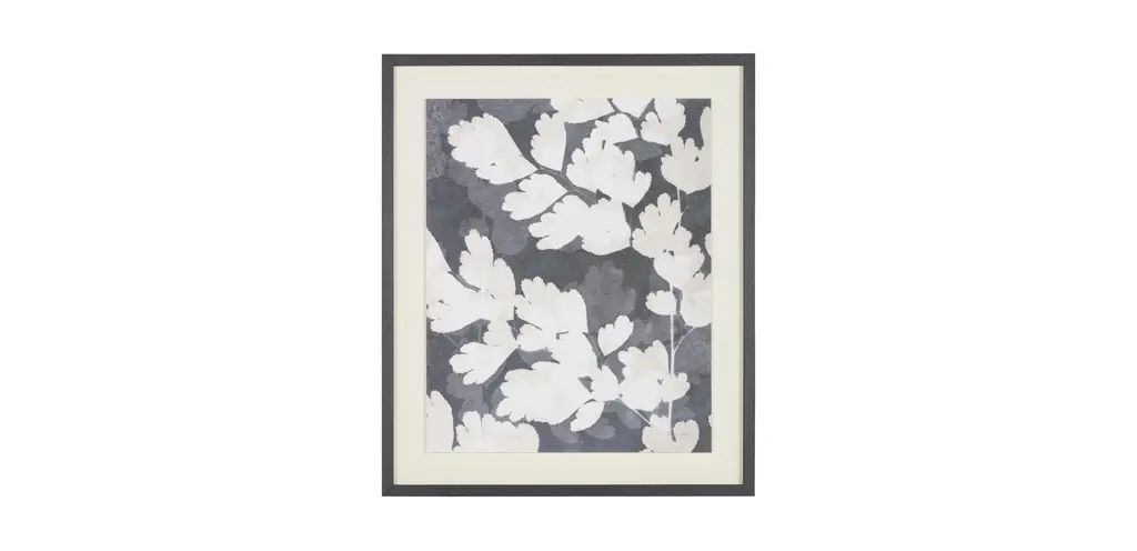 Enhance your living space with the modern 32X42 White Nights Rectangle Botanical Black Frame. This vertical framed art piece features a striking blue and white botanical print on canvas, making it a perfect addition to your office or bedroom. Made in the USA, it combines style and quality effortlessly.