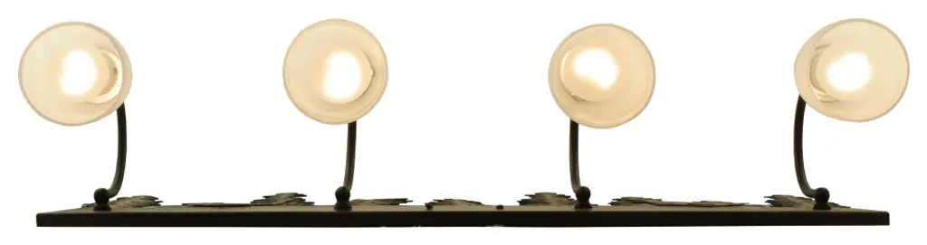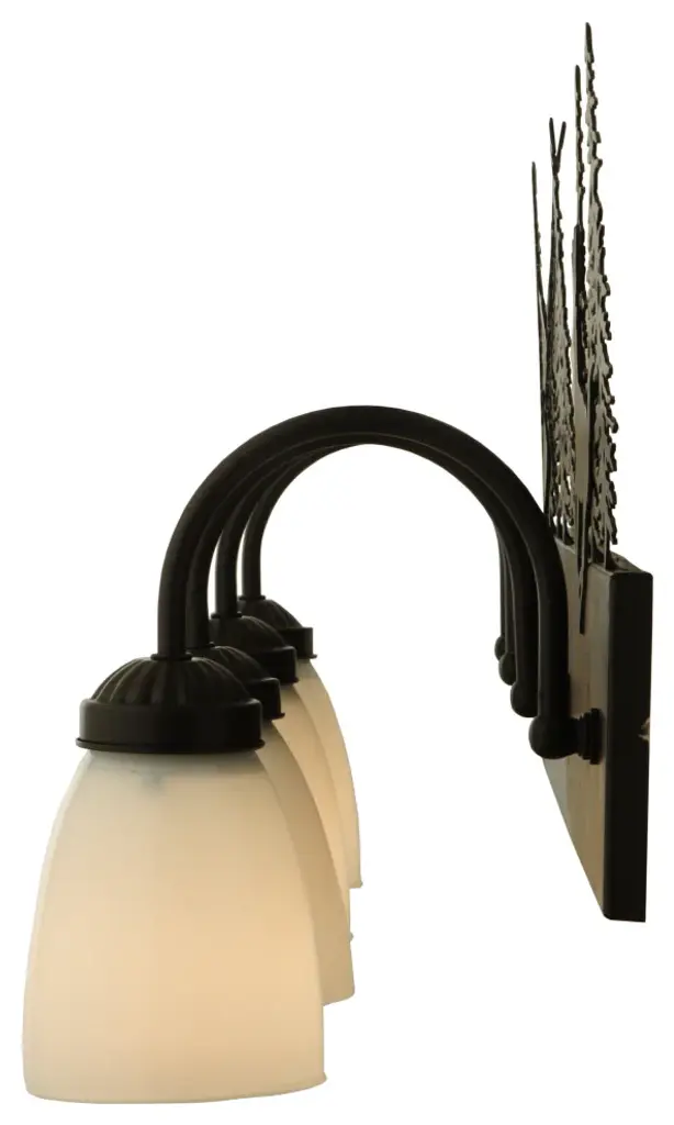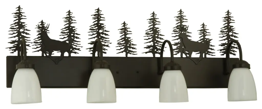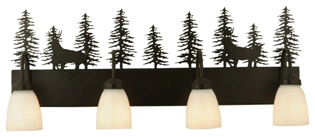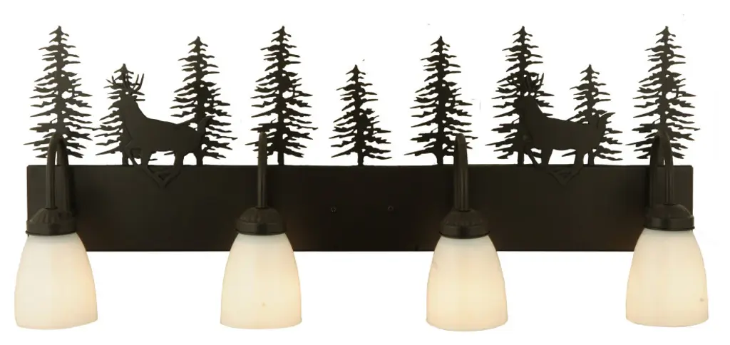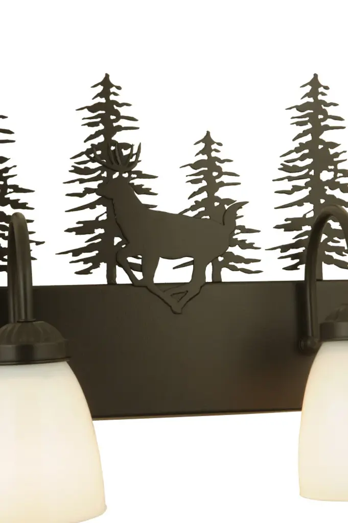 Rustic charm is captured beautifully with this striking wall fixture design of young bucks standing in the woods.Warm lighting is created by a stunning Opal White Blown Glass goblet shades enhanced by decorative accents; frame and matching hardware finished in Timeless Bronze. Use as a vanity light in a bath or a sconce in a hallway.Handcrafted in the Meyda manufacturing facility; located at the foothills of the Adirondack Mountains.Additional wildlife and custom designs available; as well as energy efficient lamping options.